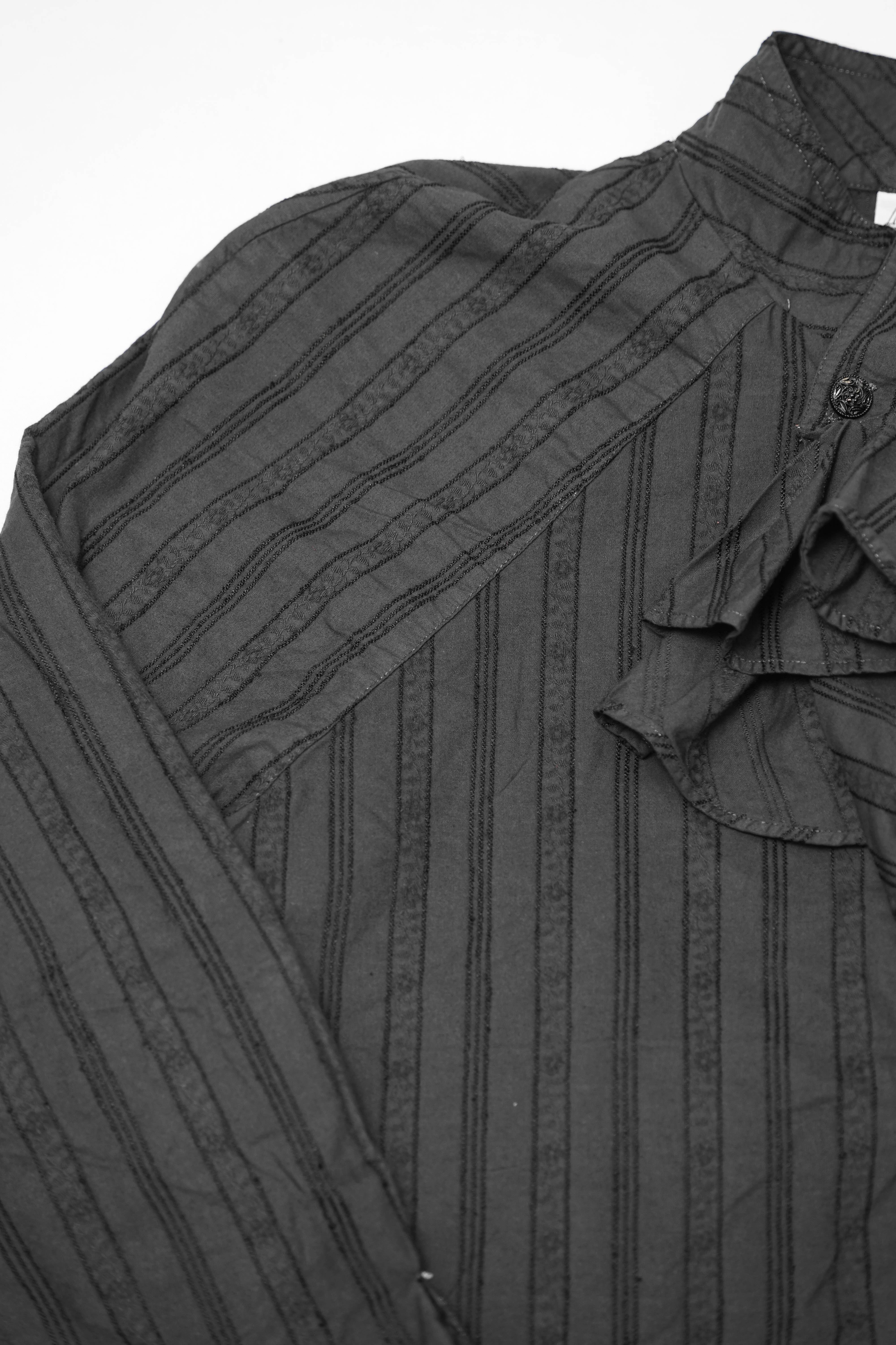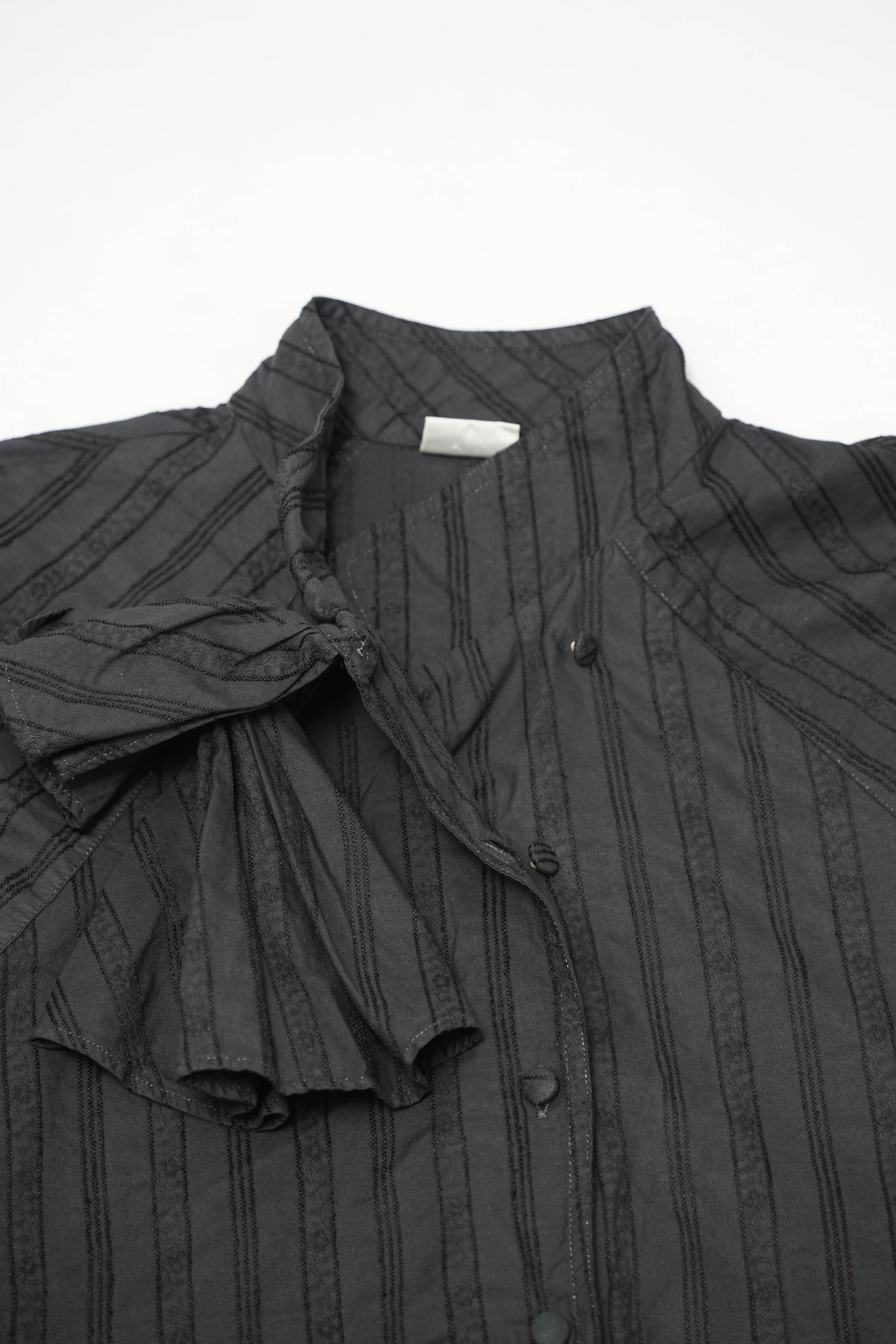 バンドカラー形状の襟元に大きめなリボンタイが特徴的な一枚です。
