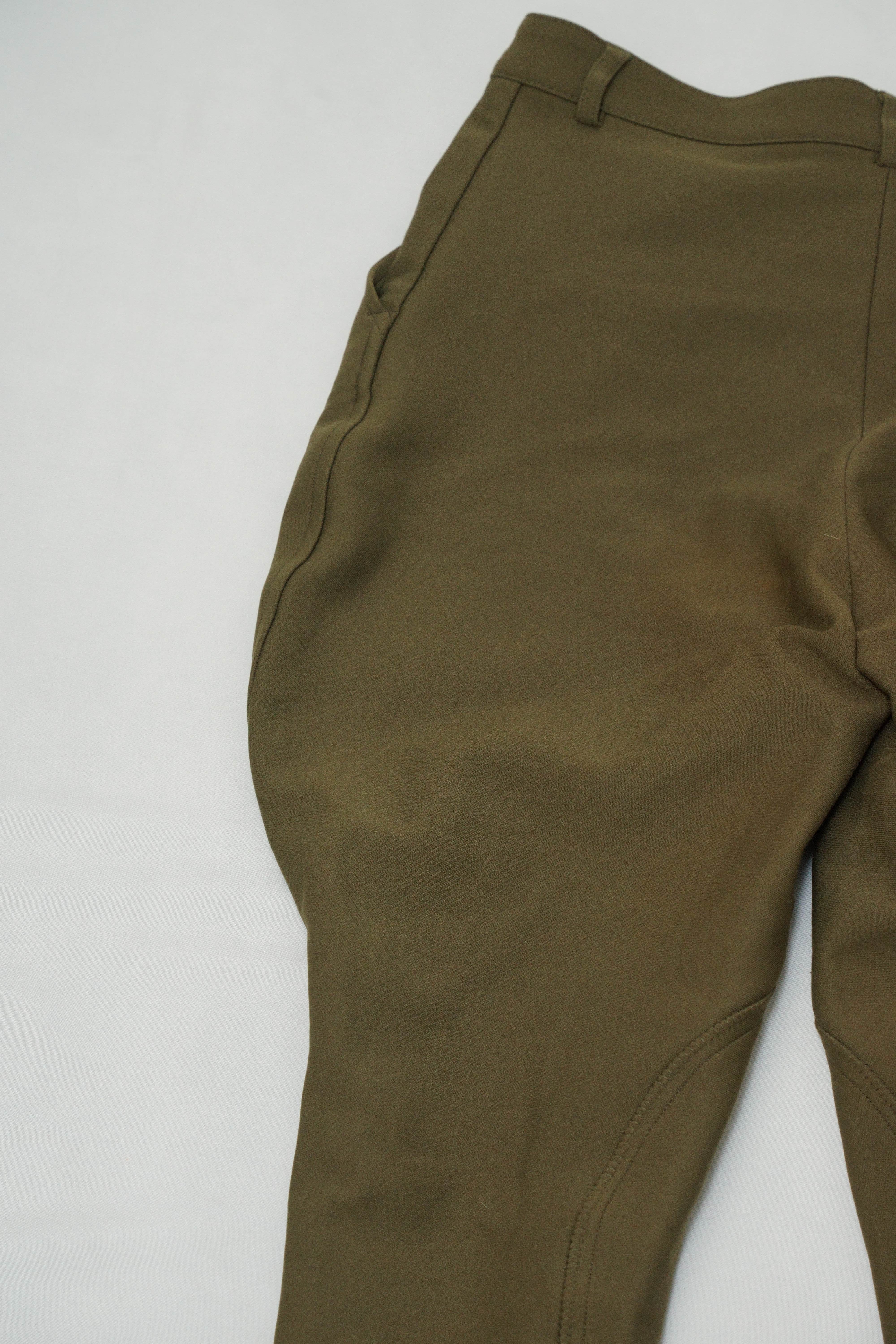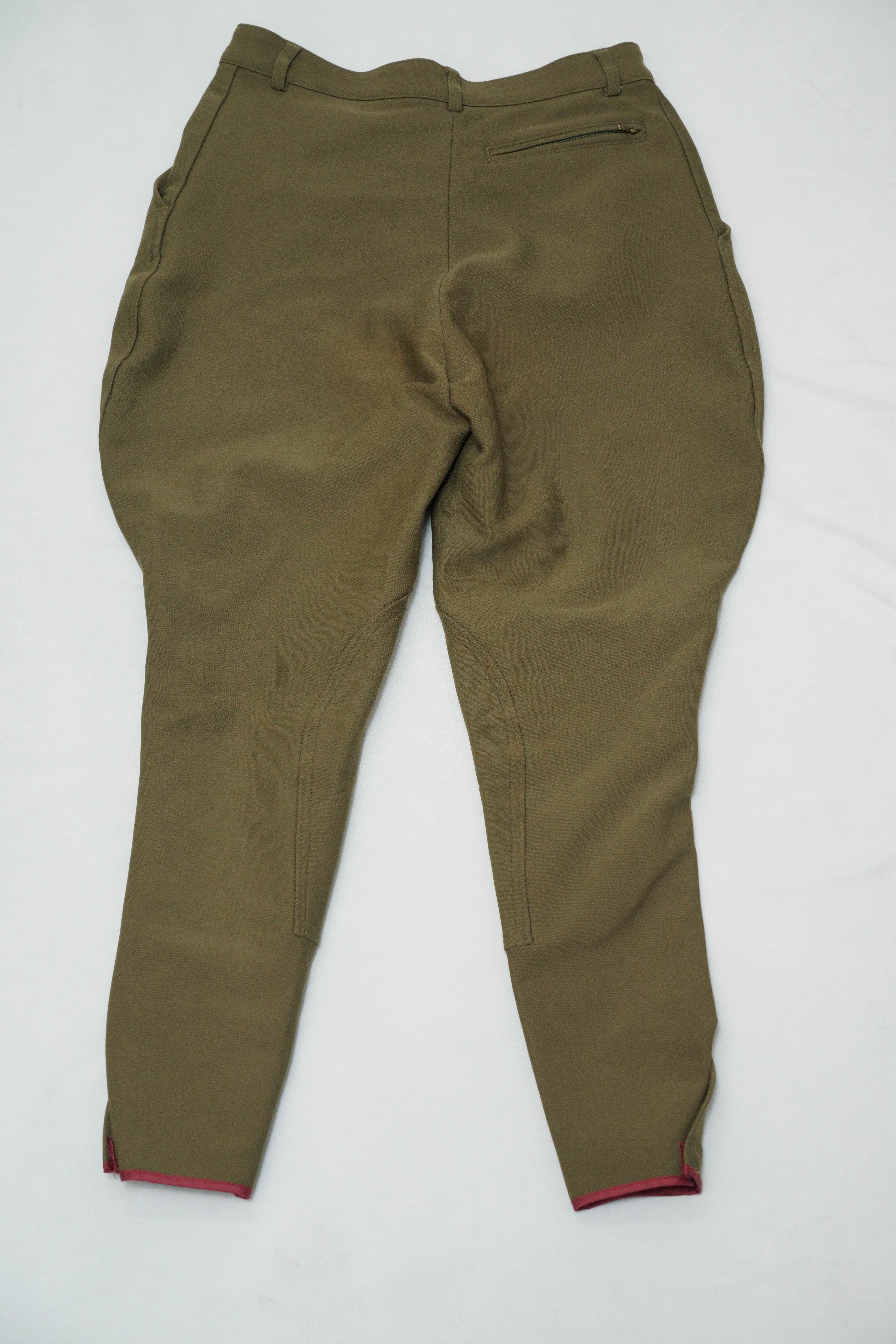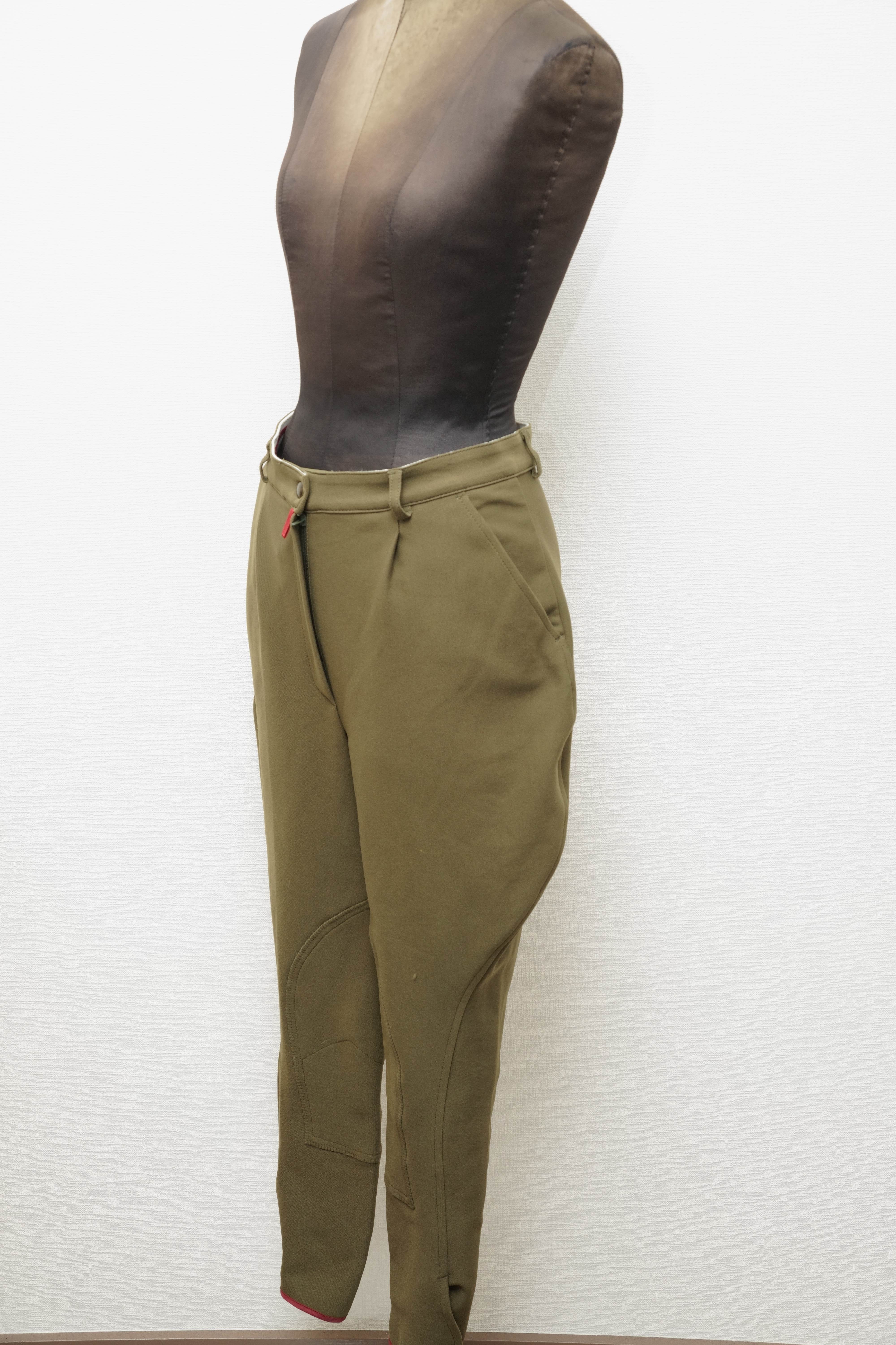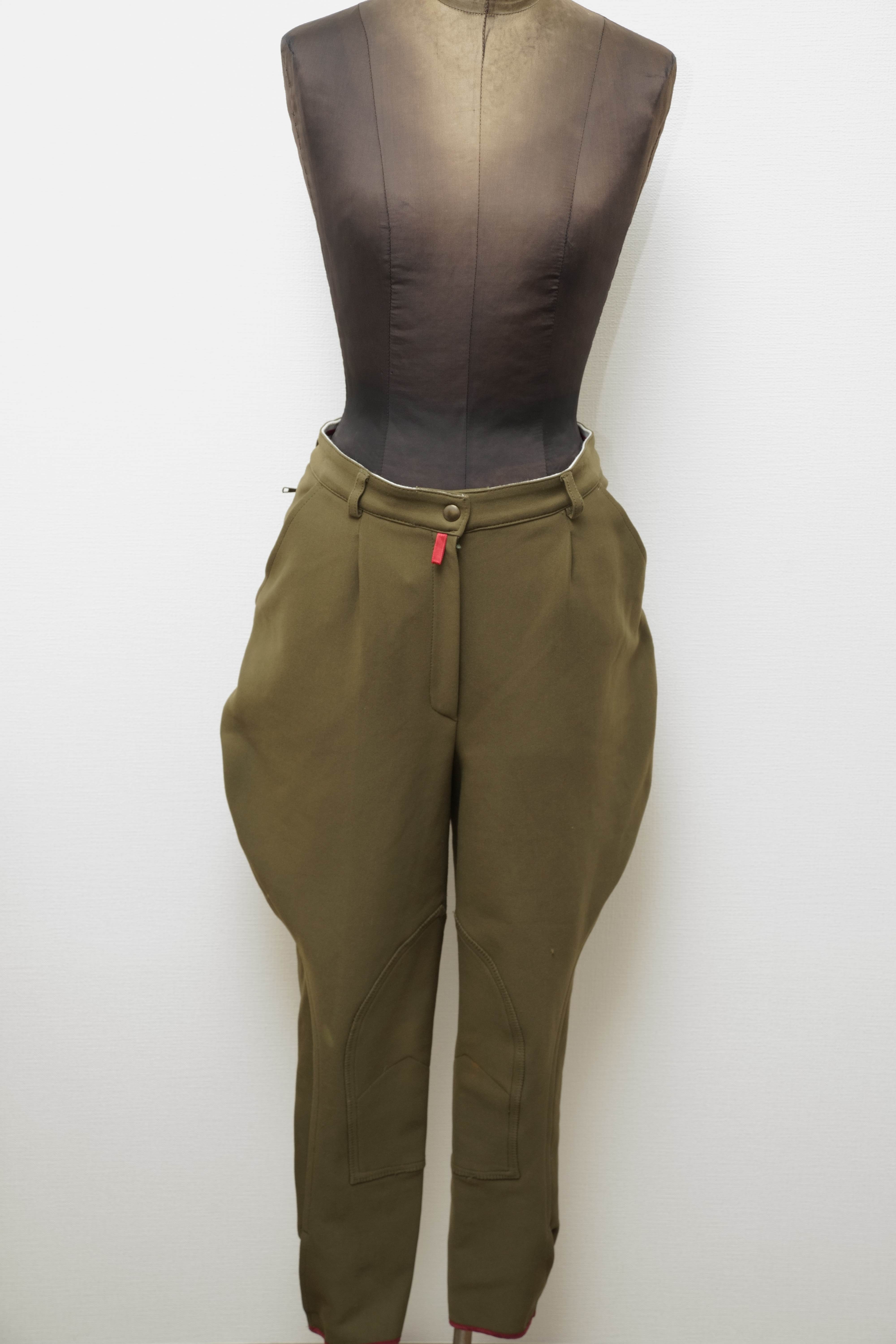 シルエットを寄せた製品と違いこちらの商品は乗馬用のパンツになりますのでヒップ部や膝辺りに乗馬時に付いたヨゴレやほつれがございます。生地素材はジャージ素材。
