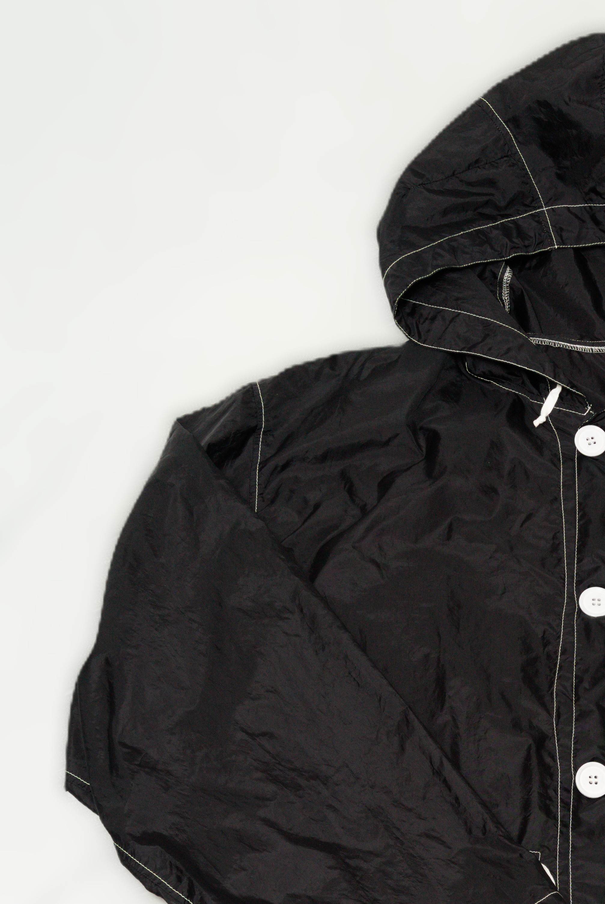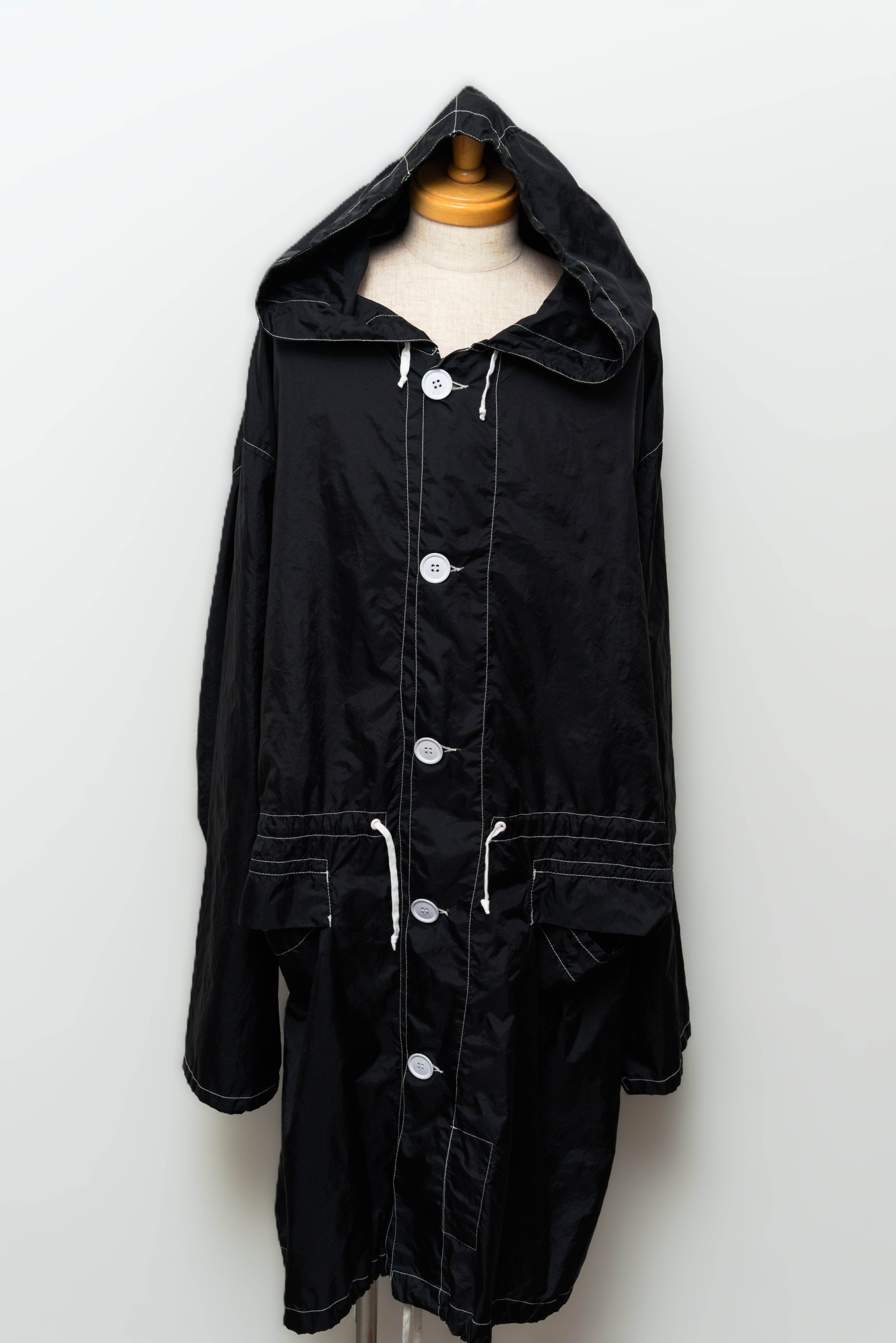 雪原でのカモフラージュ用のパーカー(オーバーコート)になりますので身幅が広く袖口も脱ぎやすいようにかなり広口になっています。ポケットは貫通仕様。腰や裾、フードにはドローコードが内蔵されており絞る事が可能。薄手のナイロン素材ですので幅広シーズンでレイヤードを楽しめる一枚です。