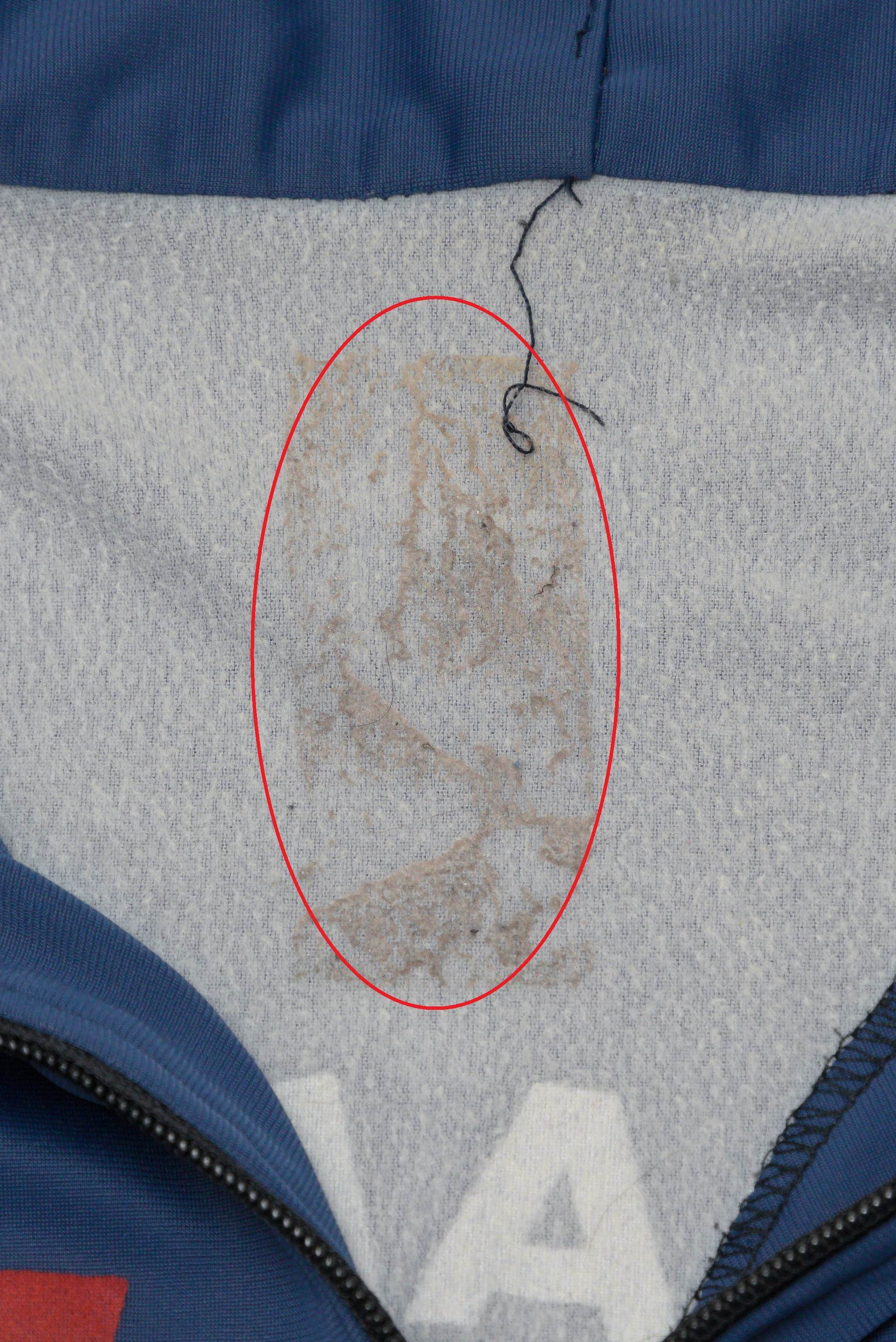内側の襟下と左ポケット脇にヨゴレ、胸のプリントが一部かすれております。