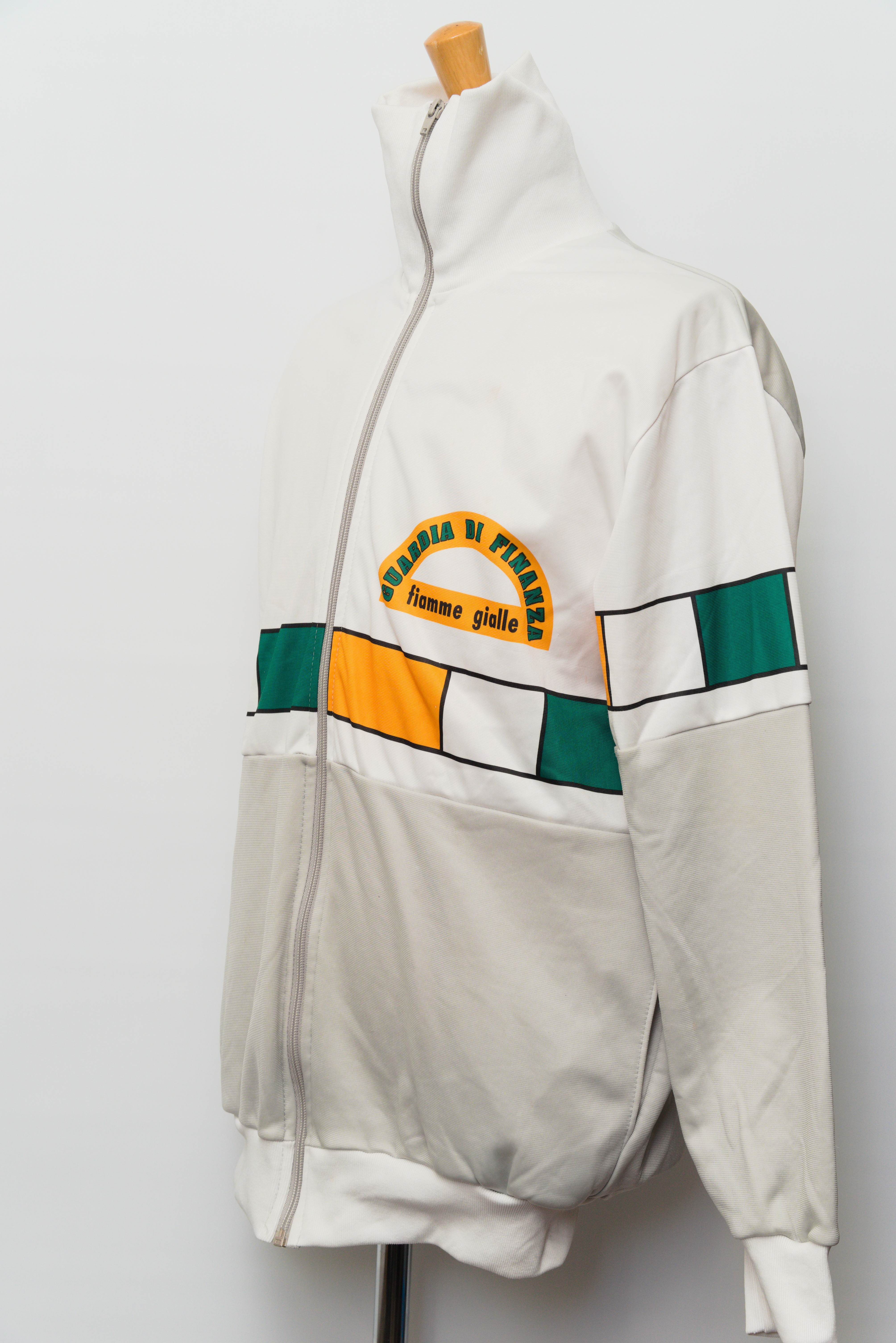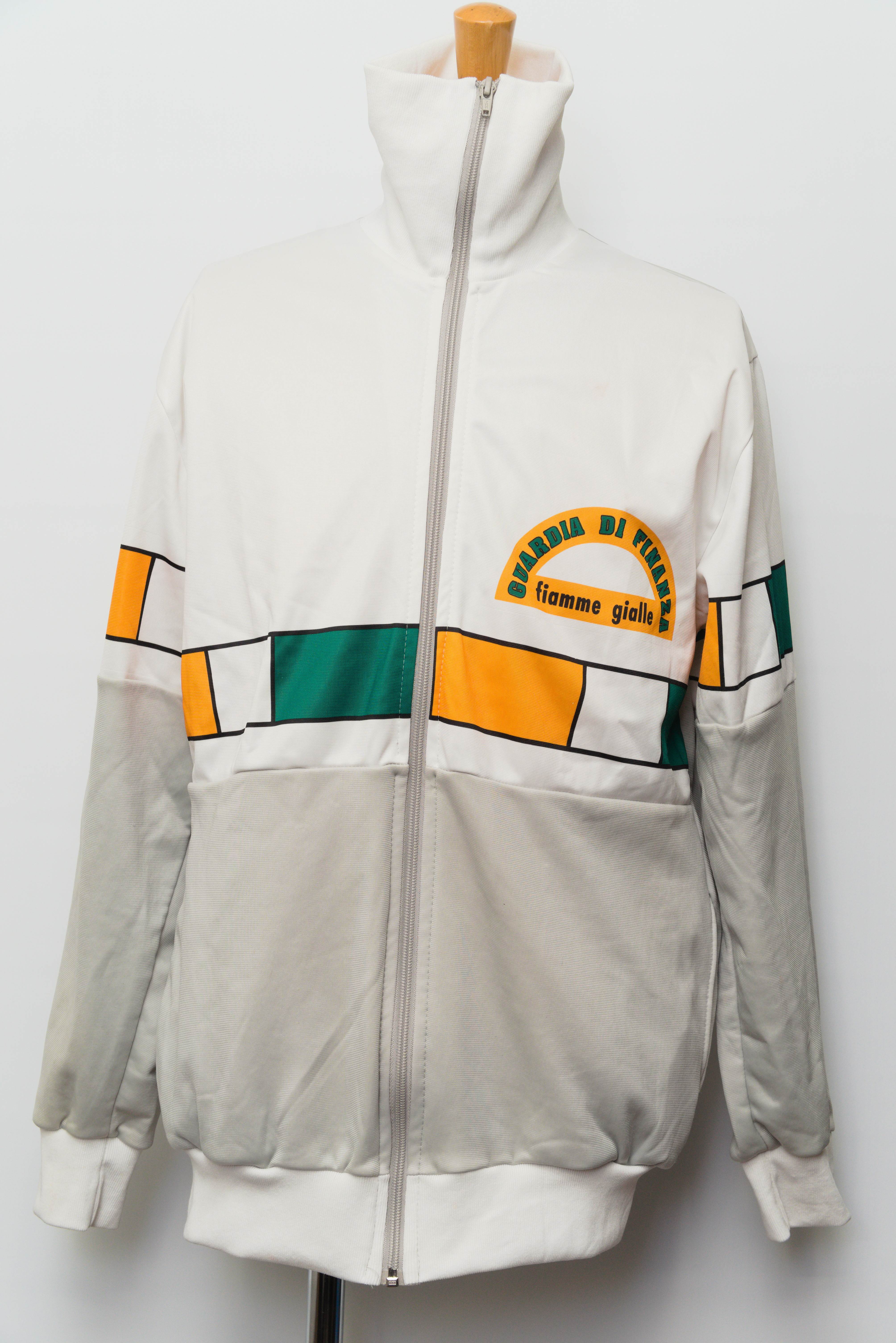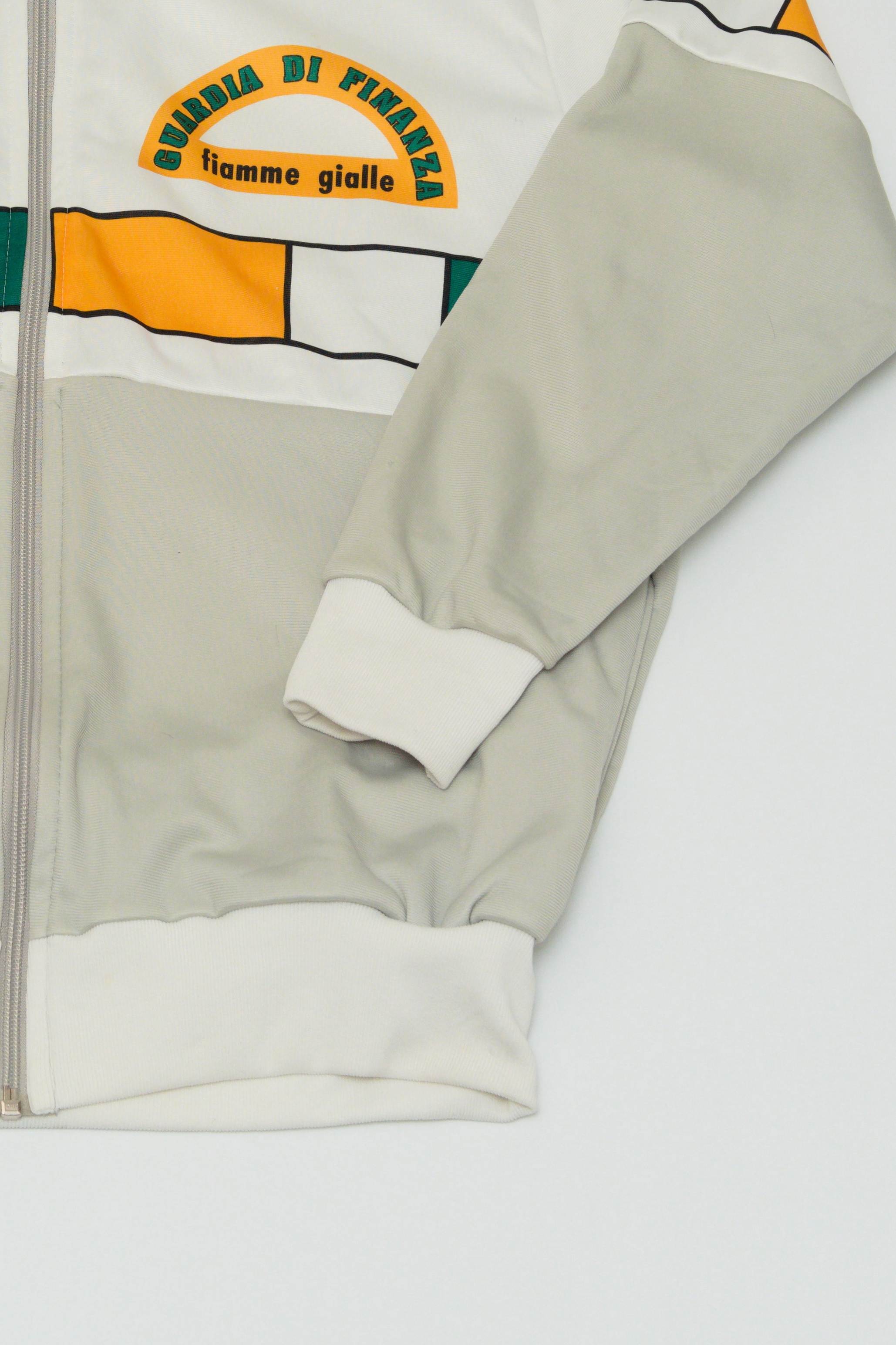 薄手の裏起毛地のトレーニングジャージで左胸には「GUARDIA DI FINANZA fiamme gialle」の文字がプリントされております。GUARDIA DI FINANZAはイタリアの財務警察や財務警備隊を指す準軍事組織で脱税や密輸、麻薬取引、詐欺、商取引犯罪などを管轄するほか、国境警備や沿岸警備も行っています。そして「fiamme gialle」はその中で活動しているスポーツチームの名称になります。日本語訳は「黄色い炎」