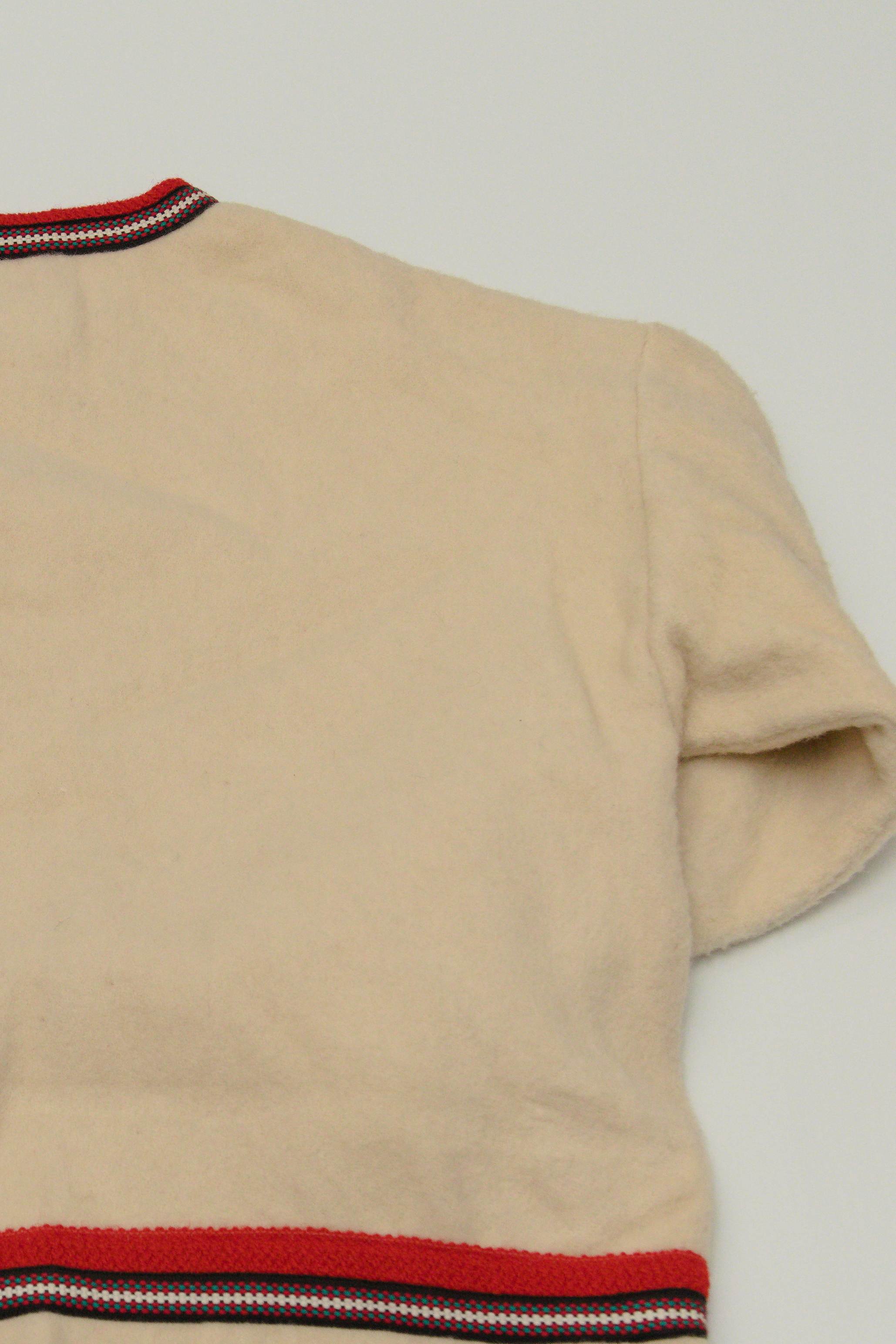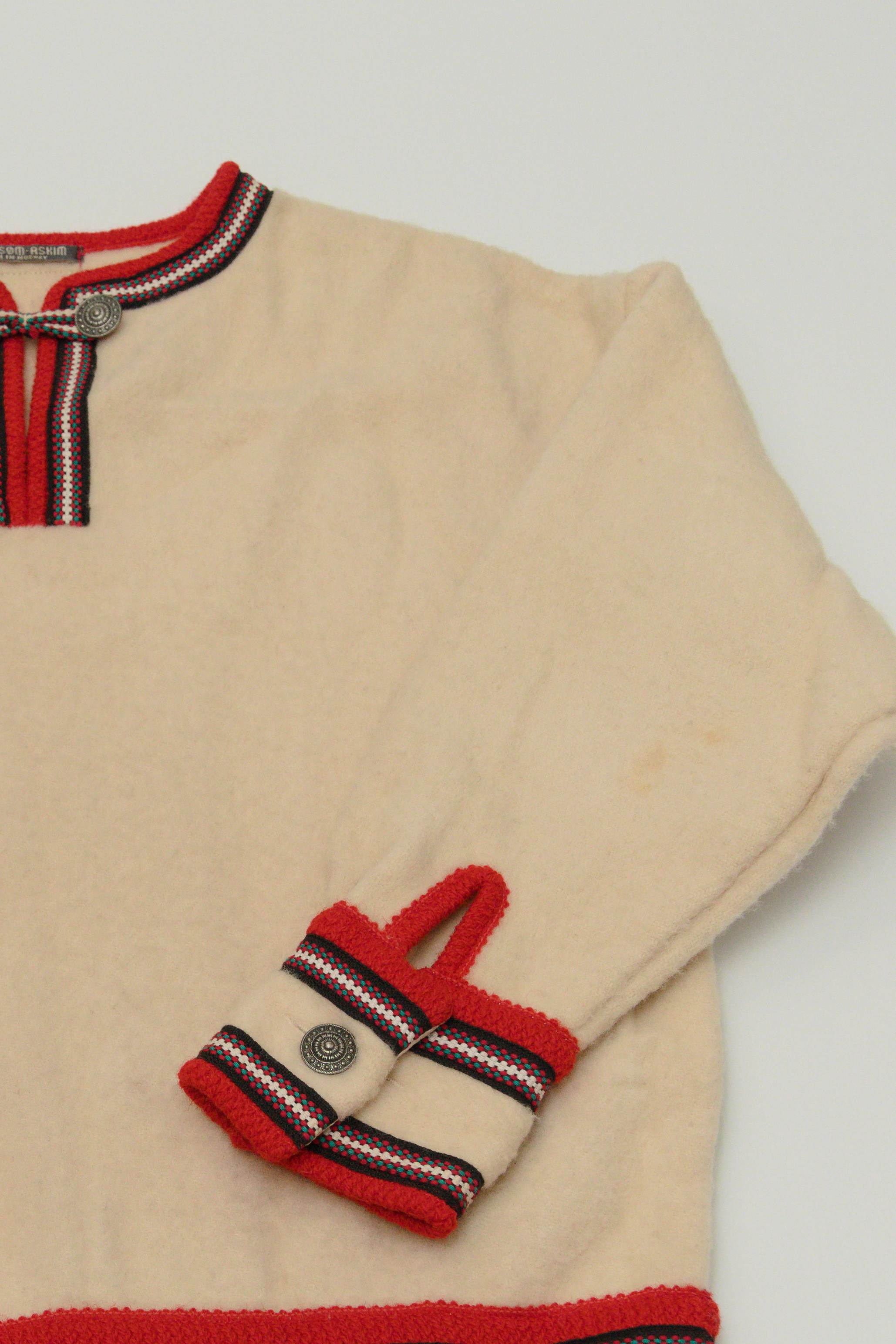 厚手のボイルドウール素材で出来ており襟元、裾、袖先に刺繍のパイピングが入ります。