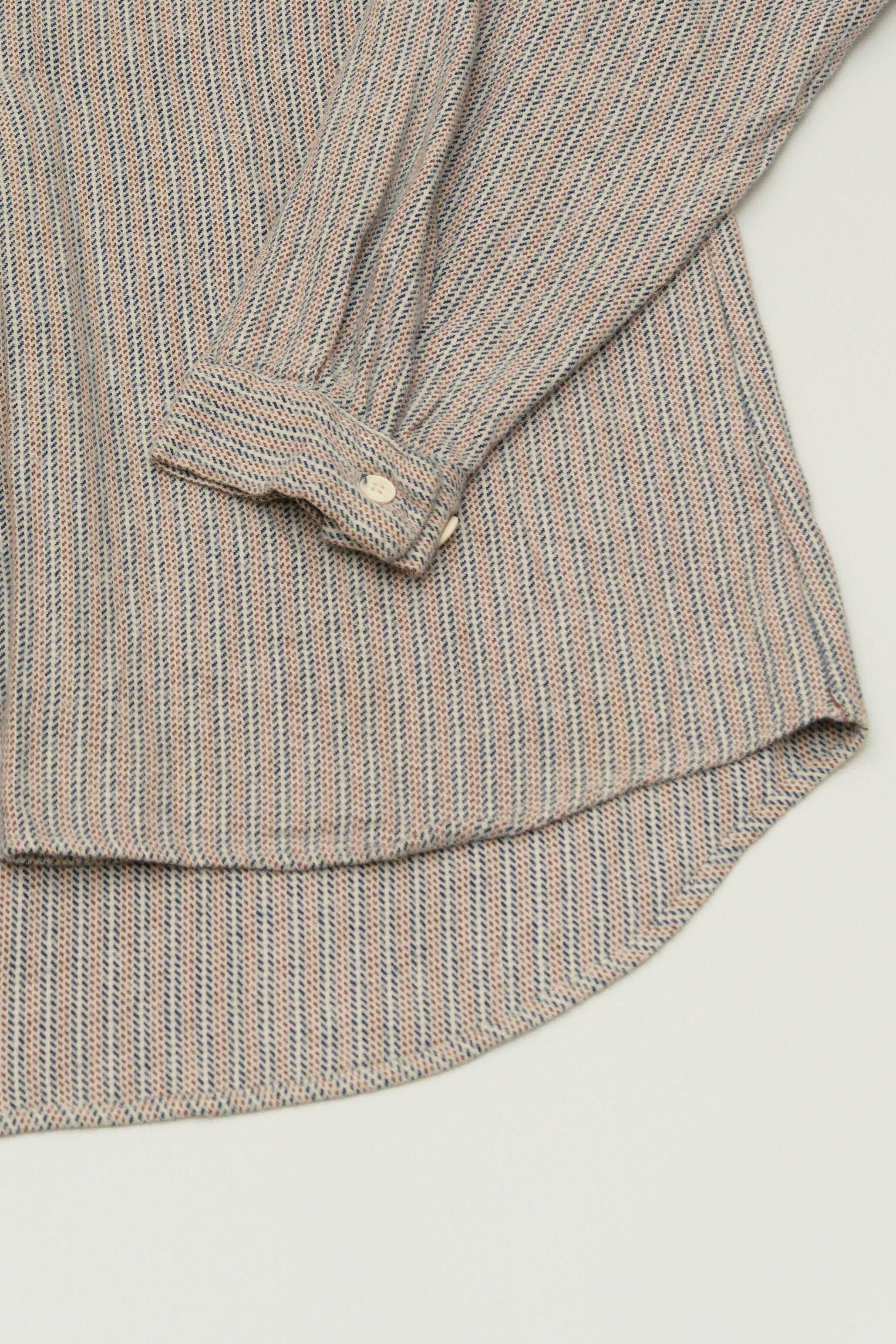 バンドカラーがスッキリとした印象を作るフランネル素材で仕立てられたストライプ柄のグランパシャツ。