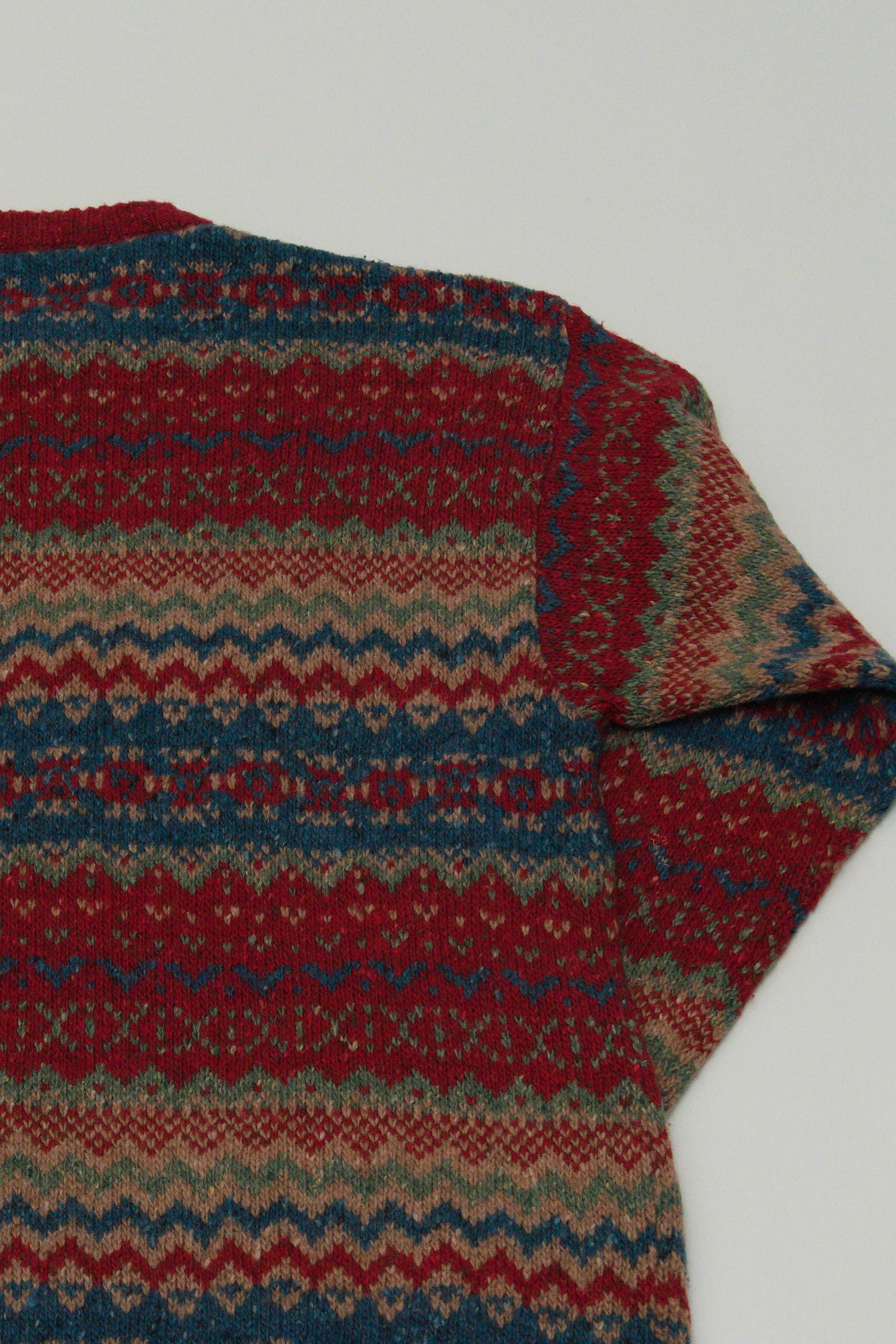 スコットランドのフェアアイル島発祥の伝統的なニットの編み柄で、段ごとに異なるカラフルな幾何学模様が特徴的な一枚です。