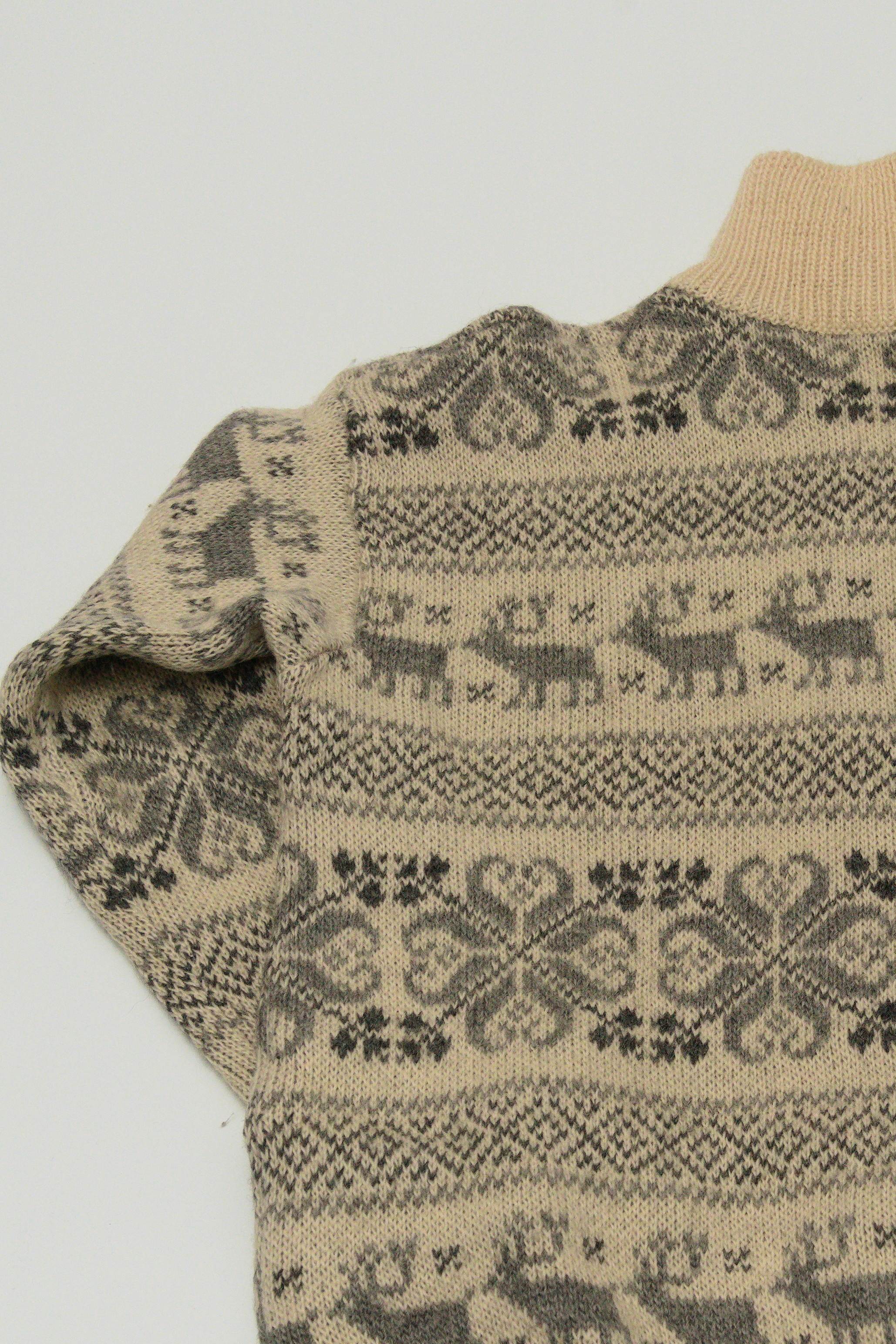 ノルディック柄が施されたスキーニットウェアメーカー製らしく肉厚なニットのジップアップセーター。ノルディック柄ですがホワイトカラーなのでコーディネートもしやすい一枚です。