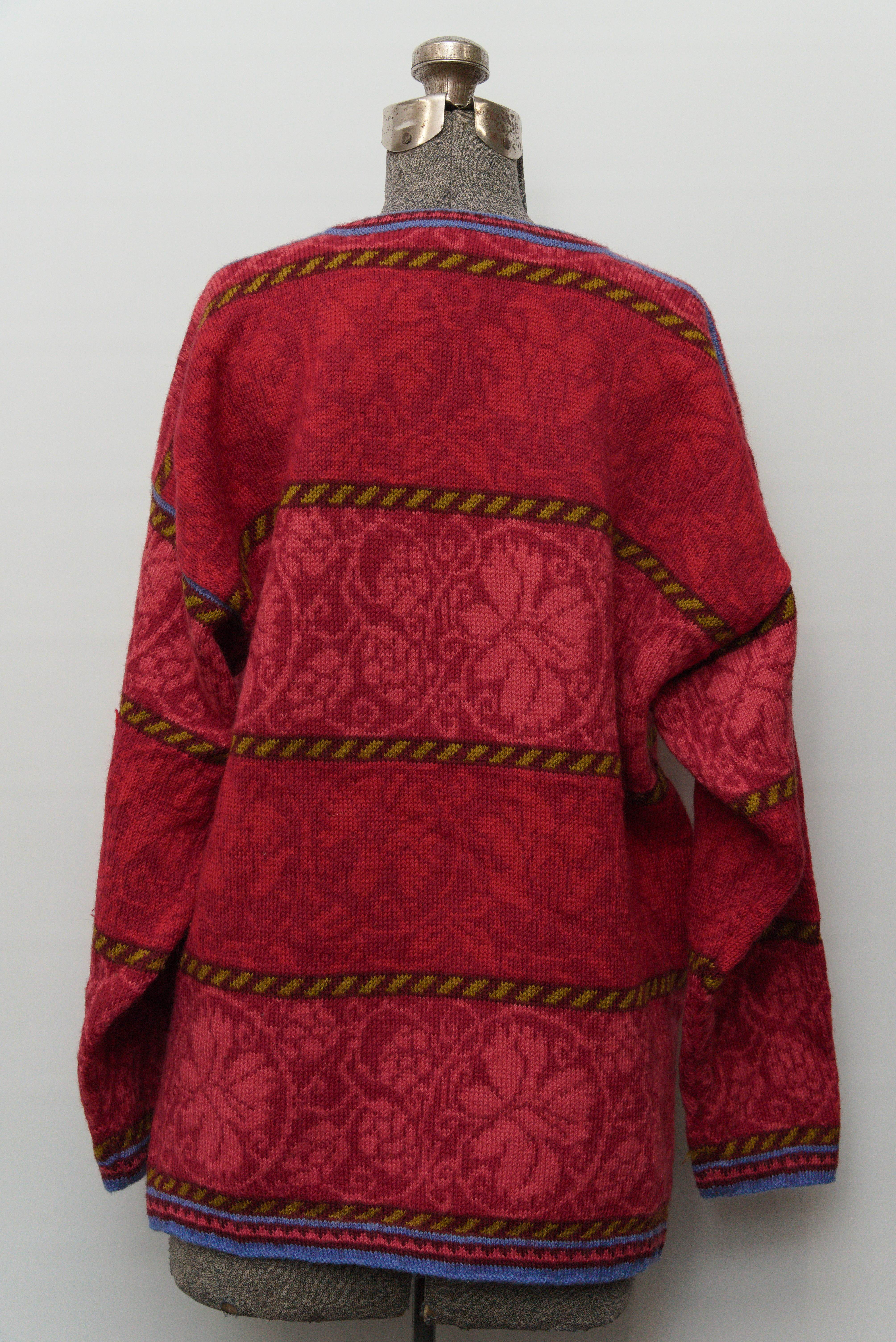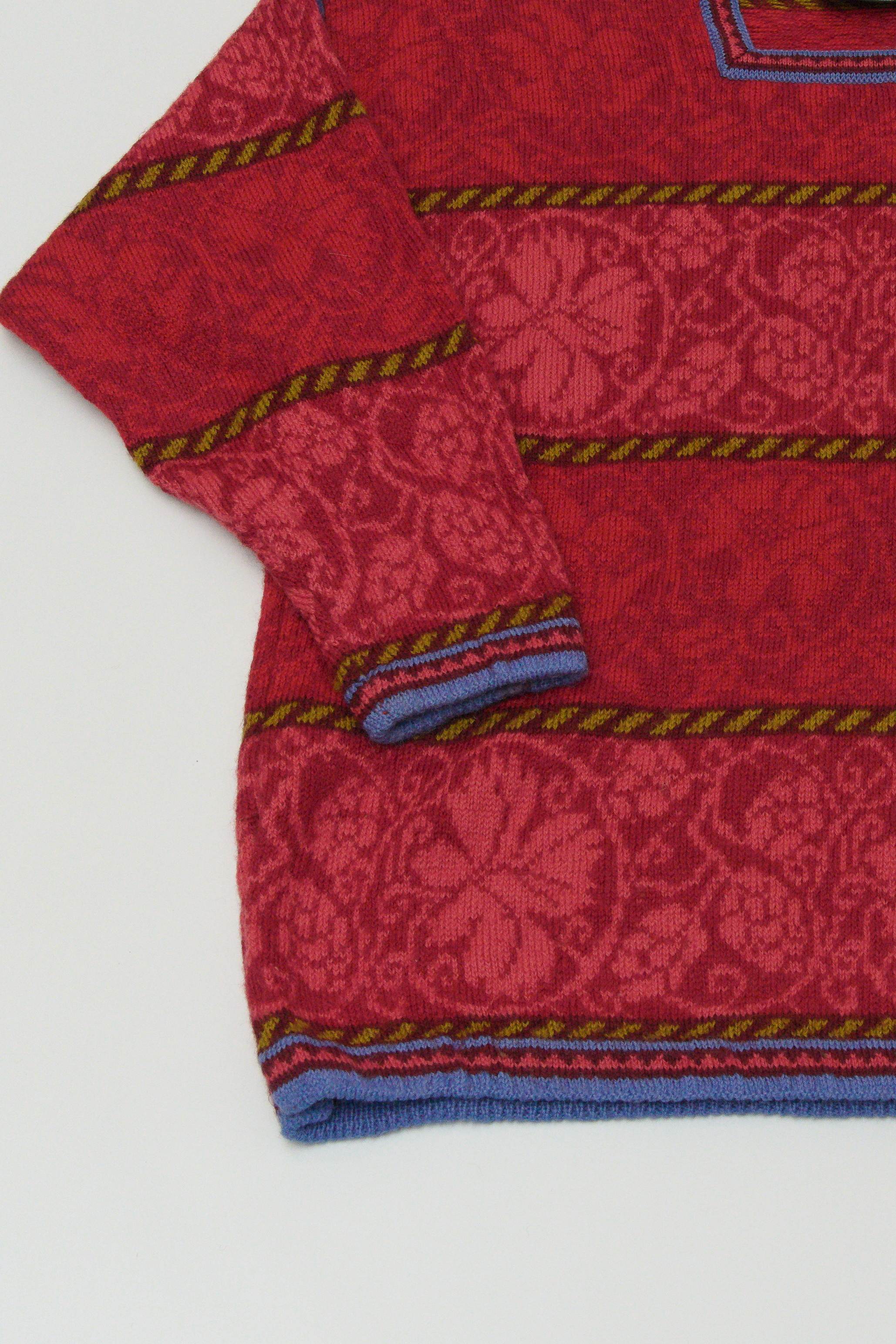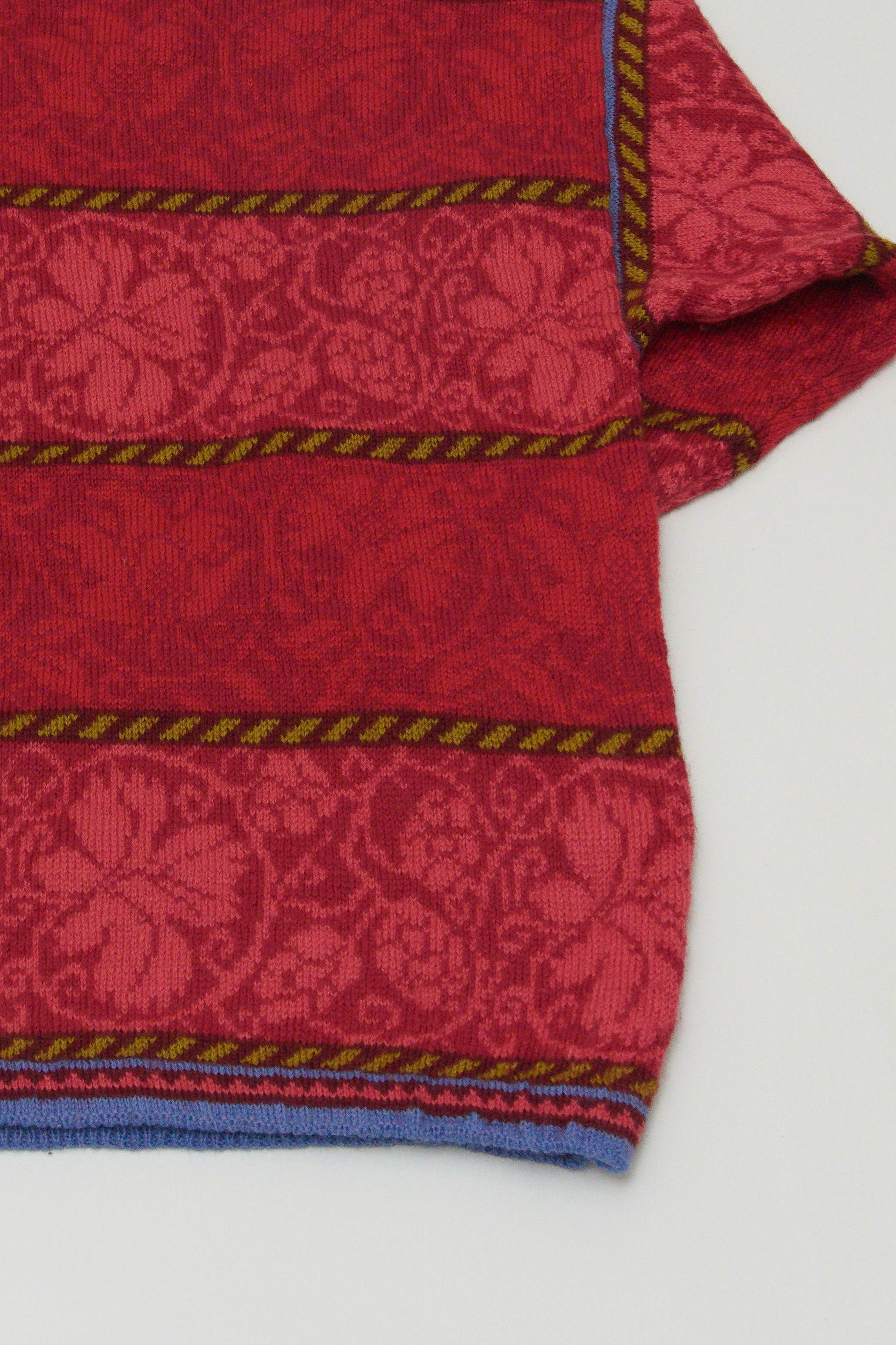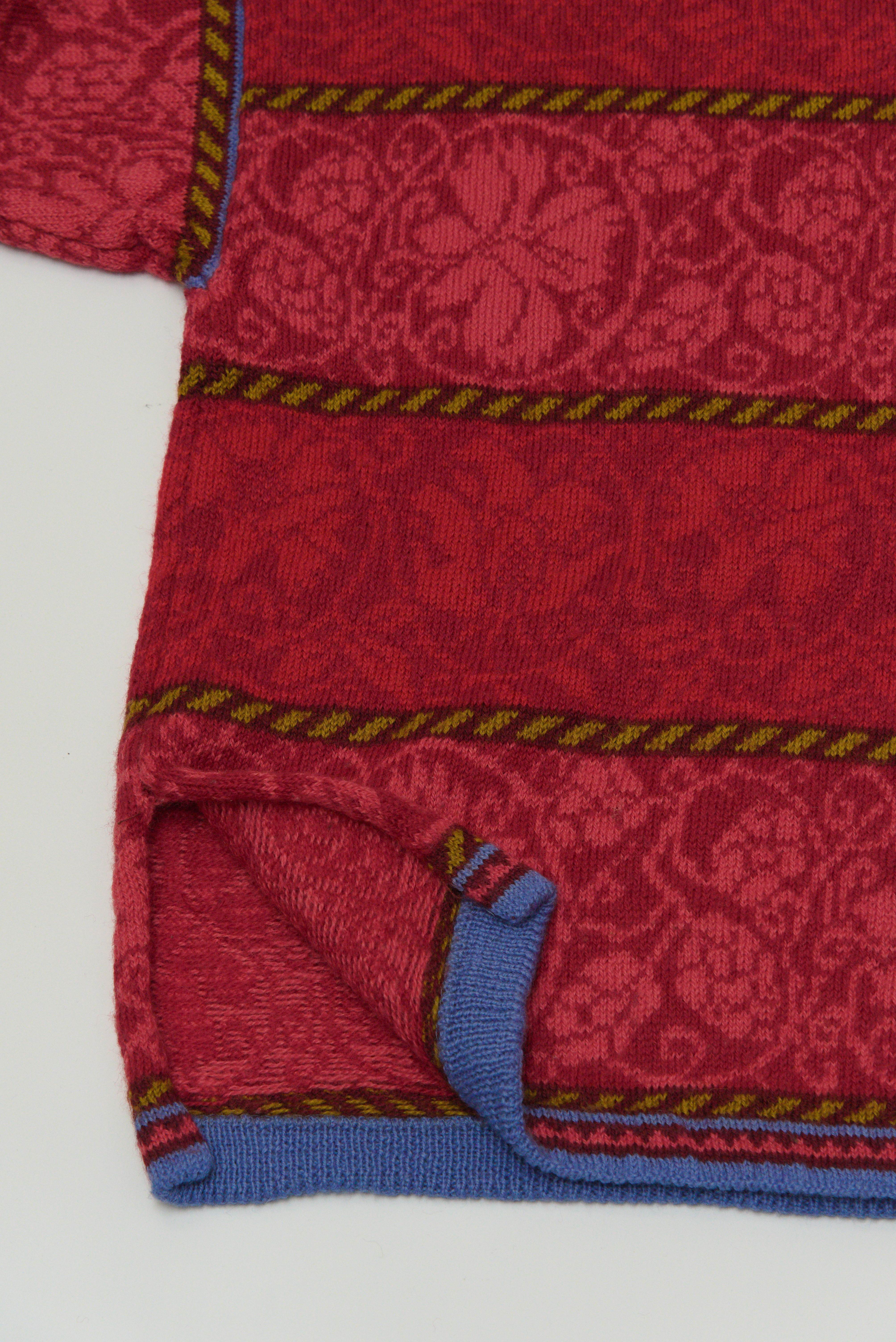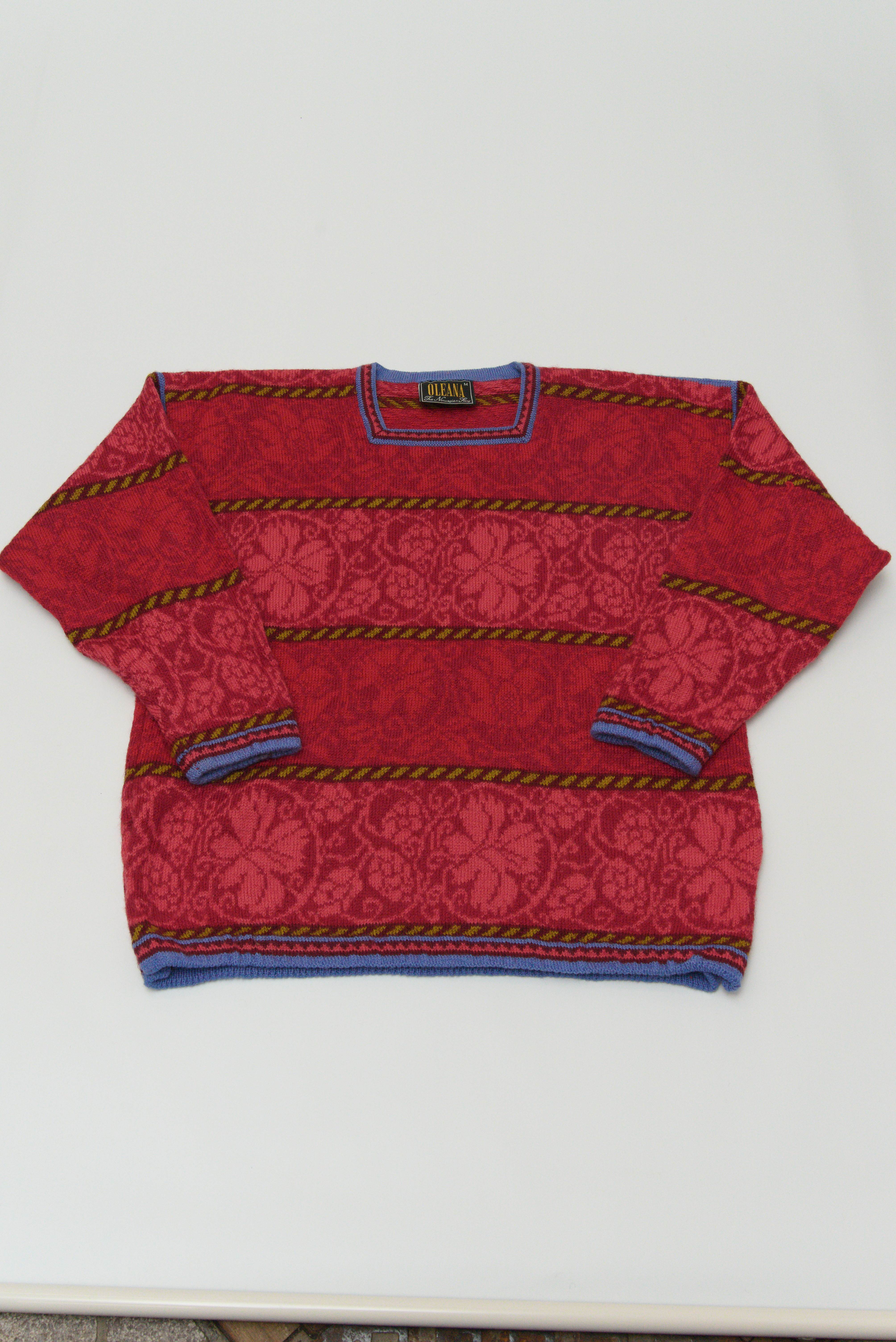 1992年創業の比較的新しいニットブランドですが北欧伝統柄をベースに、花をモチーフにしたダマスク模様・横段切替・強めのカラーコントラストで構成された、OLEANAらしいクラシカルでモダンなデザインのセーターです。