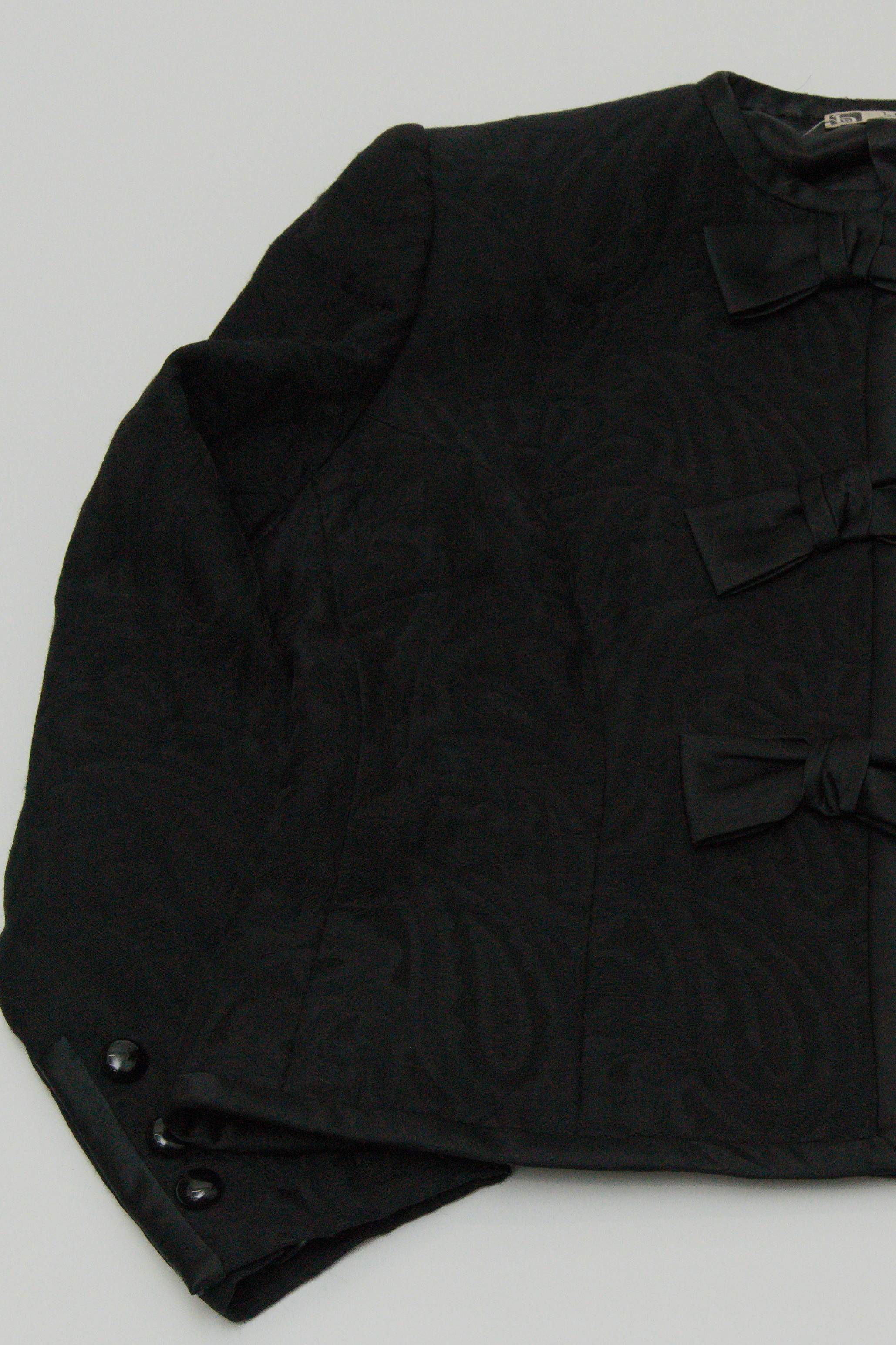 ペイズリー柄のジャガード生地で仕立てられた大きなリボンが特徴的な一着
