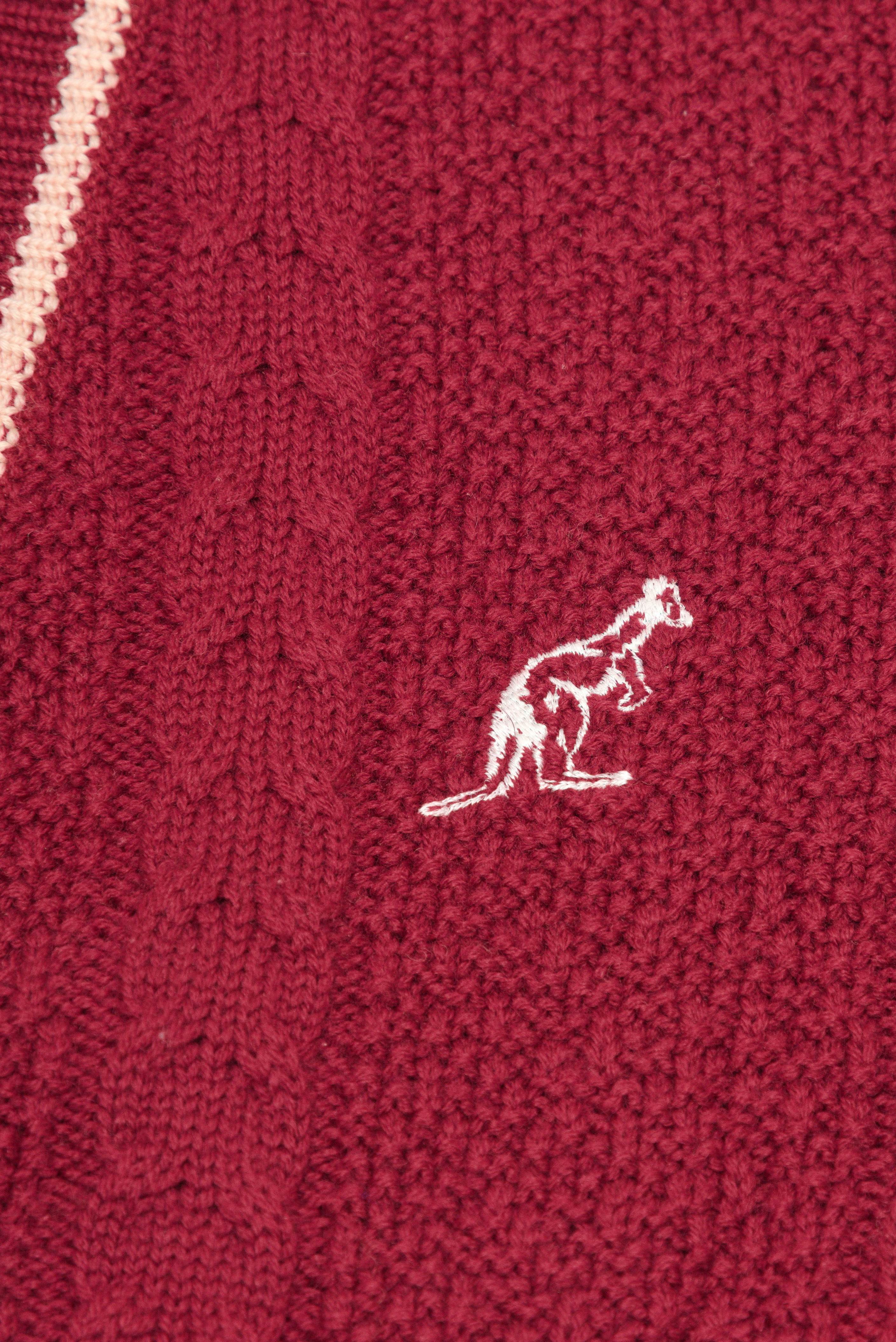 ケーブル編みとネック周りと袖先に入ったラインが特徴の一枚。胸元には同社のシンボルマークのカンガルーの刺繍が入ります。