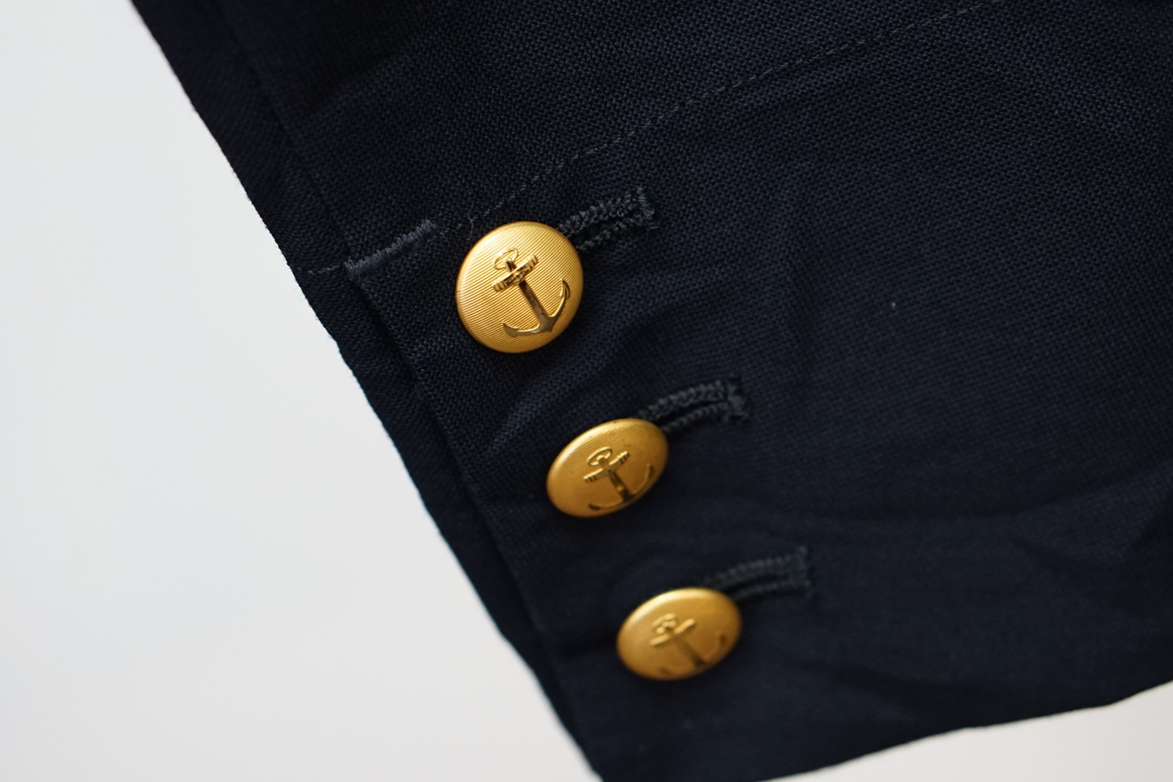 アンカーが刻印された金ボタン採用でフロントボタン1点留め仕様のプルオーバーです。
