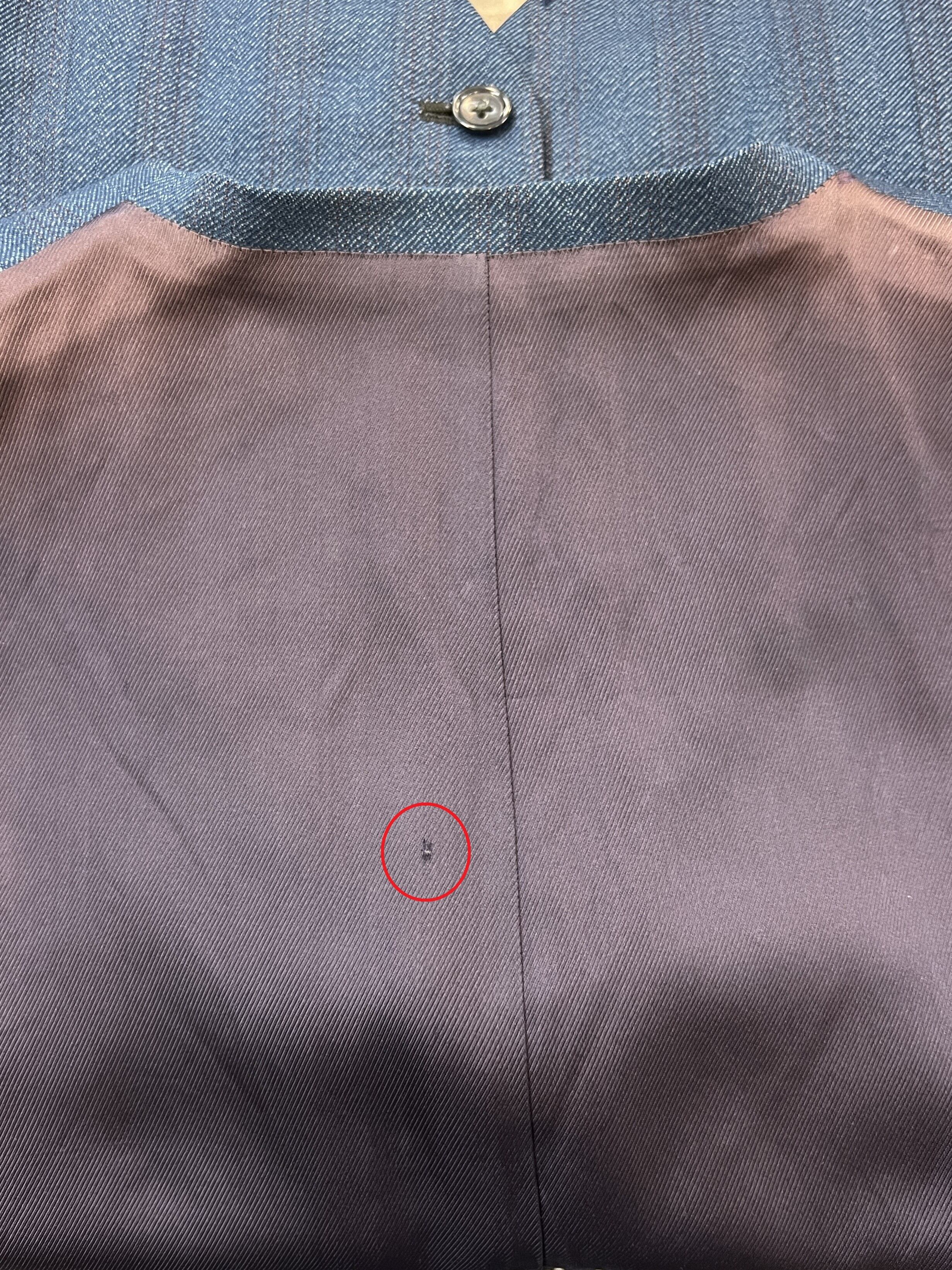 内側には全体的にシミが見受けられます。両肩に日焼けの他、右脇腹部分、背中、下ボタン付近に小さなホツレや穴がございます。