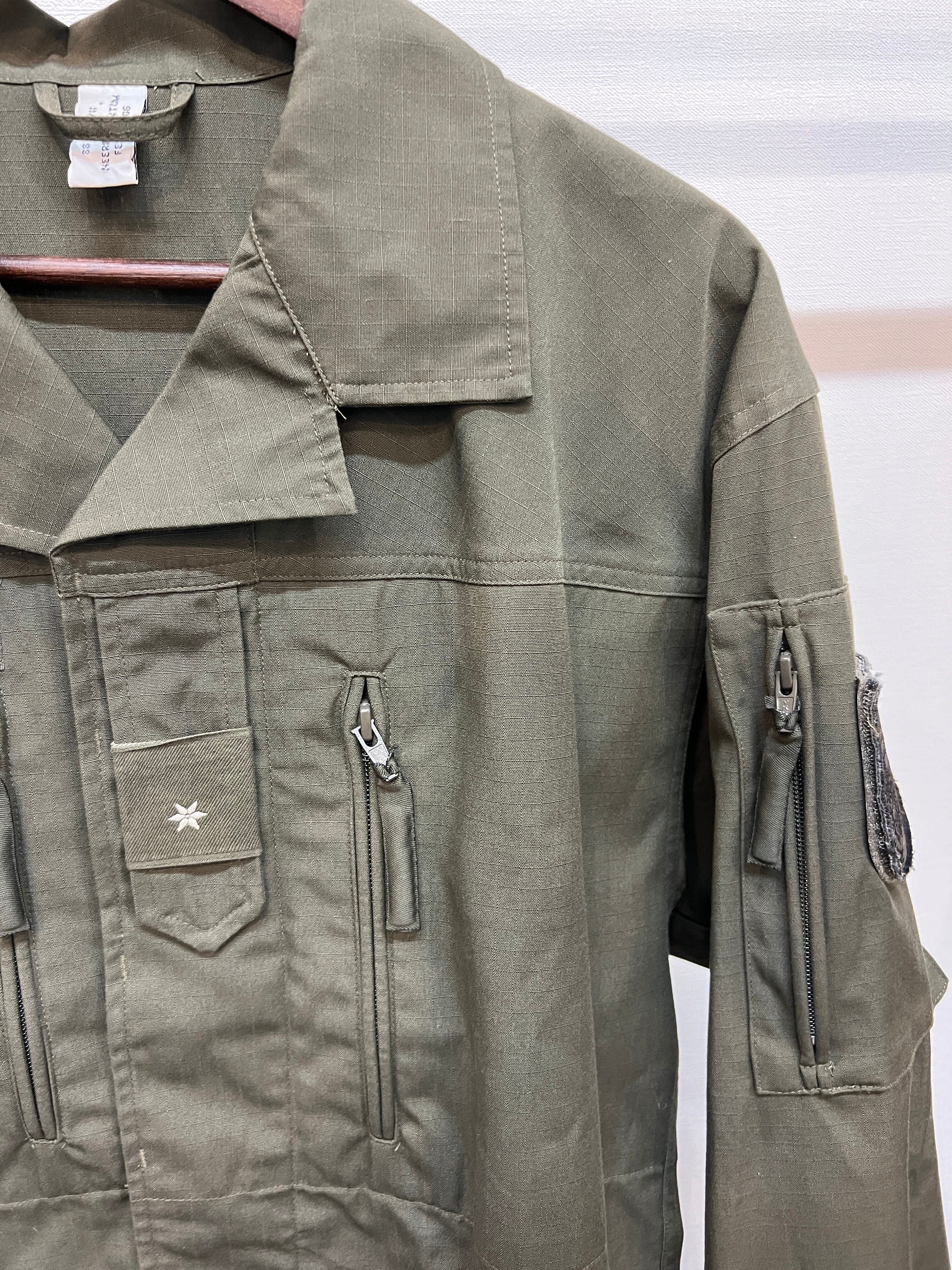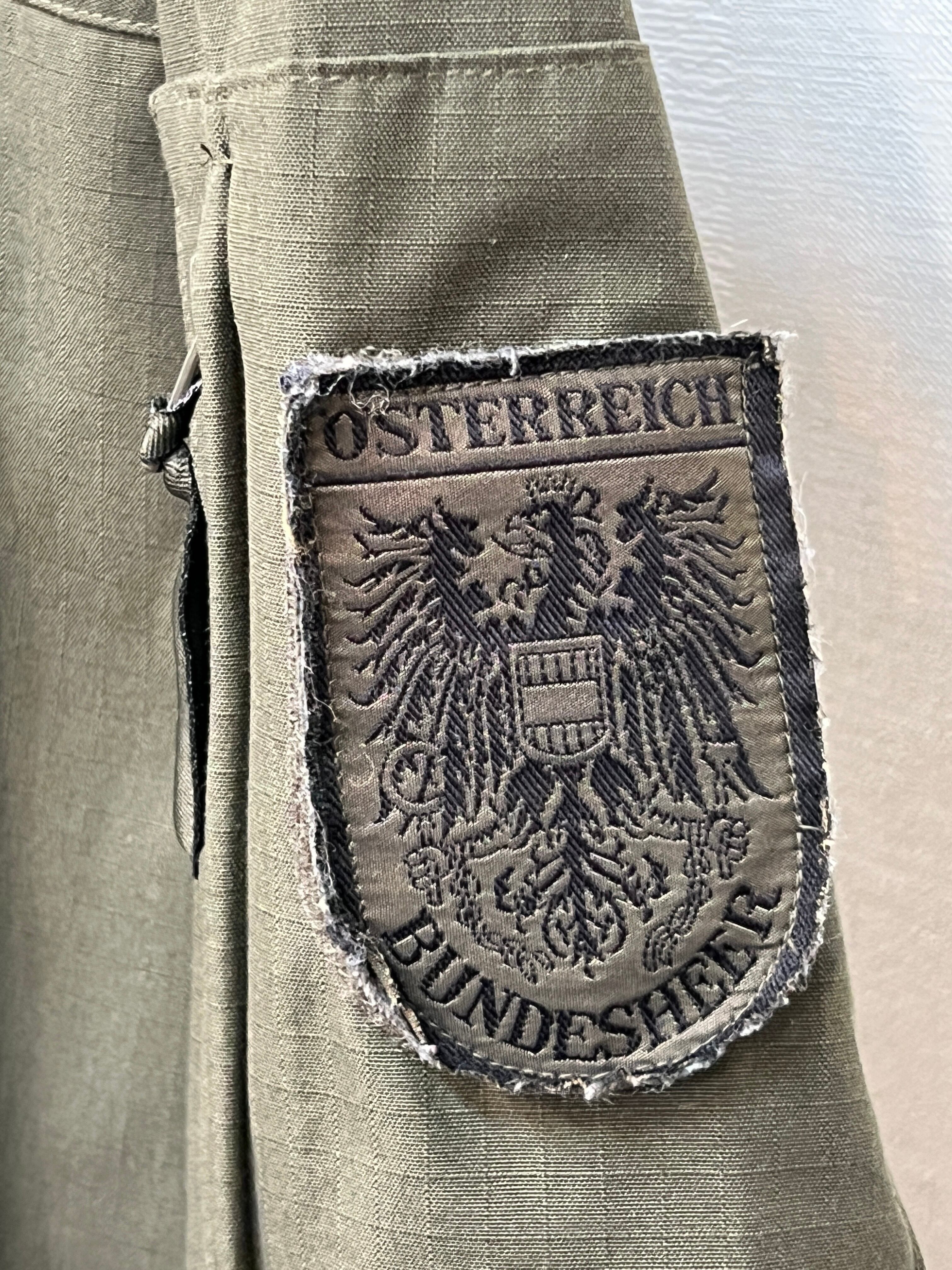 フランス軍のF2ジャケットに良く似た胸の縦型のポケットや胸のベルクロなどのデザインが特徴的です。フロント中央には階級章などを取り付けるためのループが備わっておりワッペンが残っております。またオーストリア軍のベルクロスワッペンも一枚付属します。前立てが2重の比翼仕立てです。