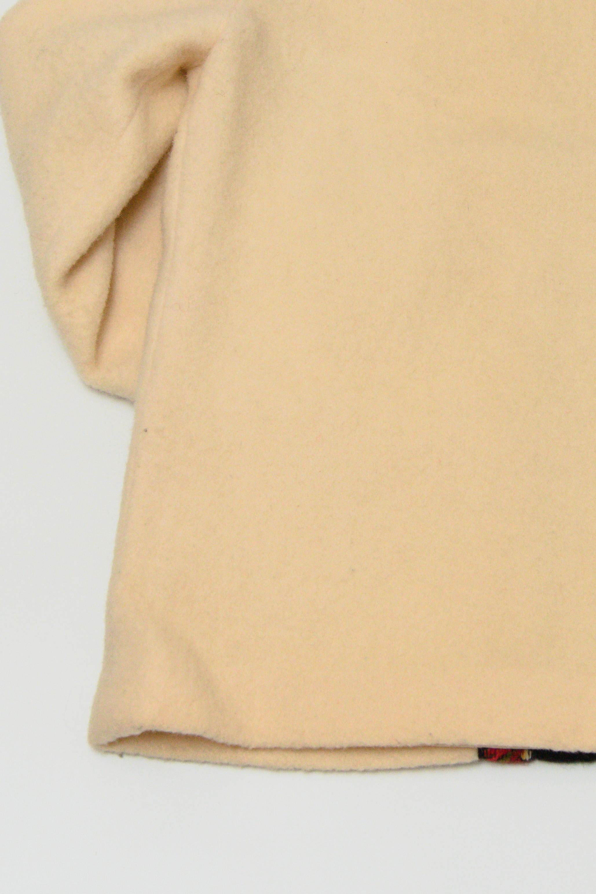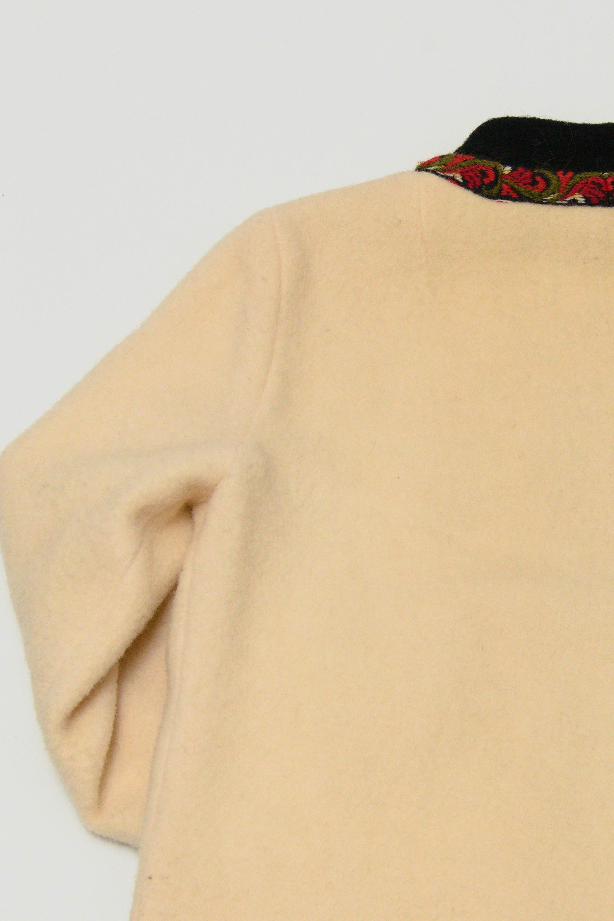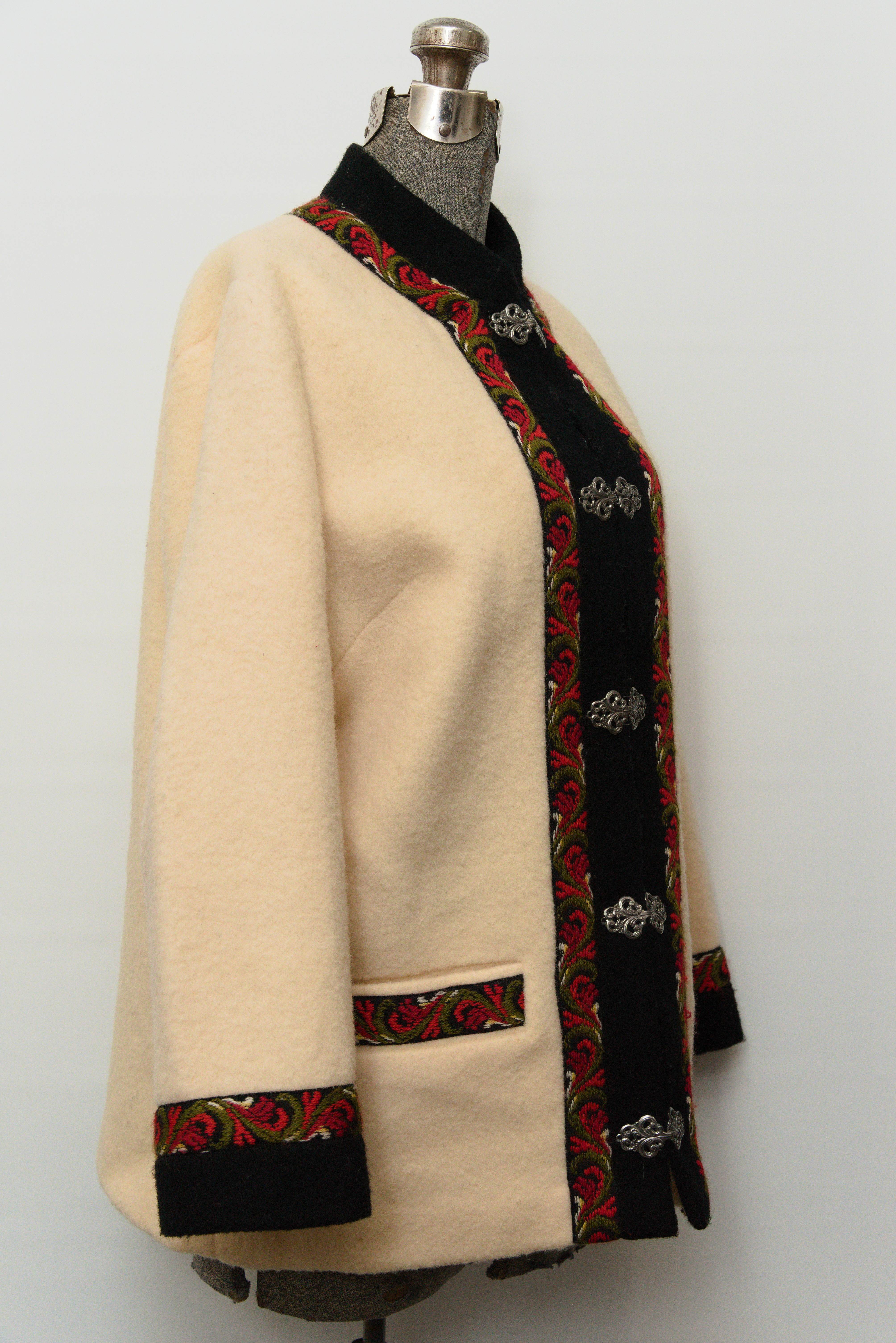 裏地付きの厚手のボイルドウール地にチロリアン柄が刺繍で施されており、前身頃は重厚なメタルフック仕様になっております