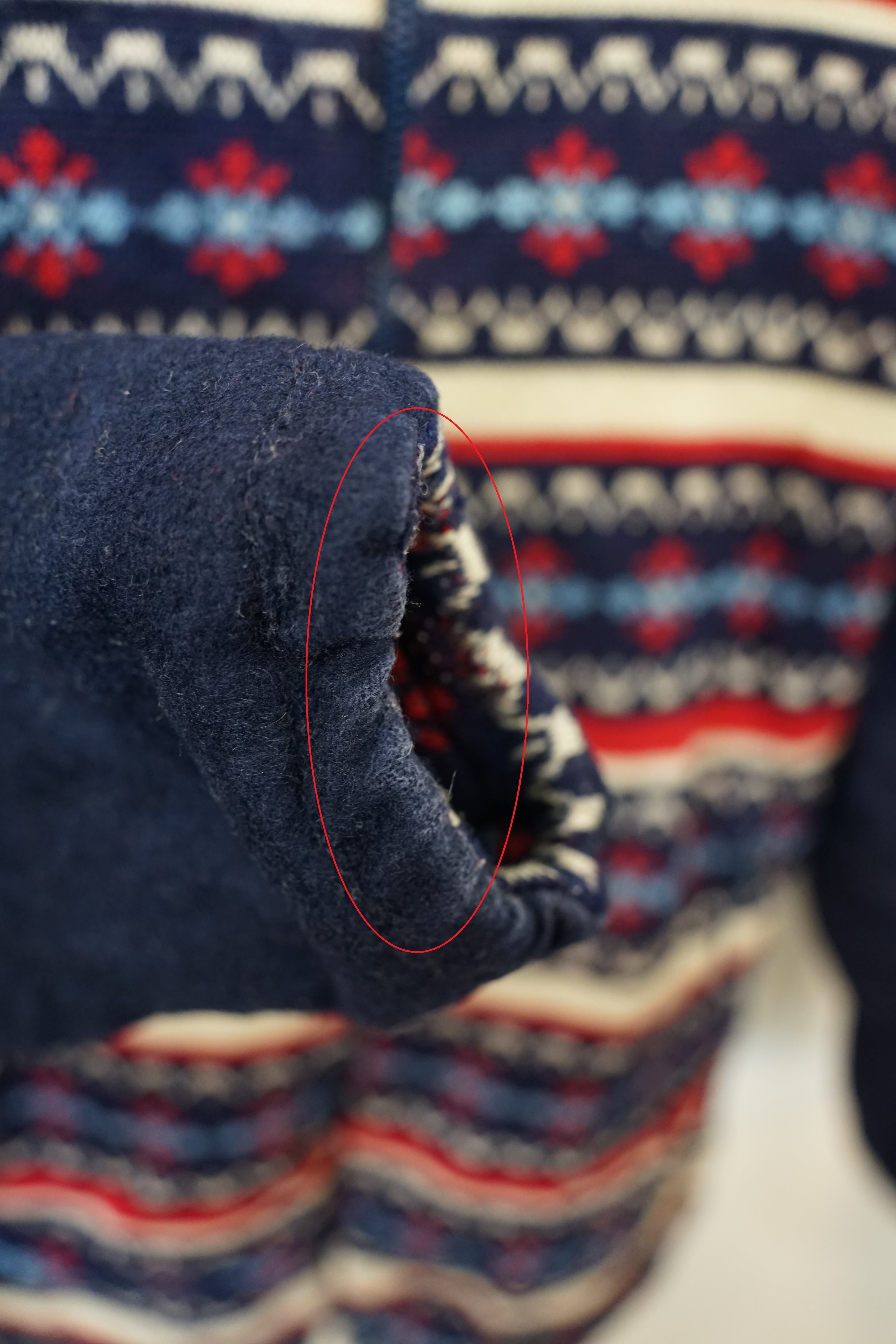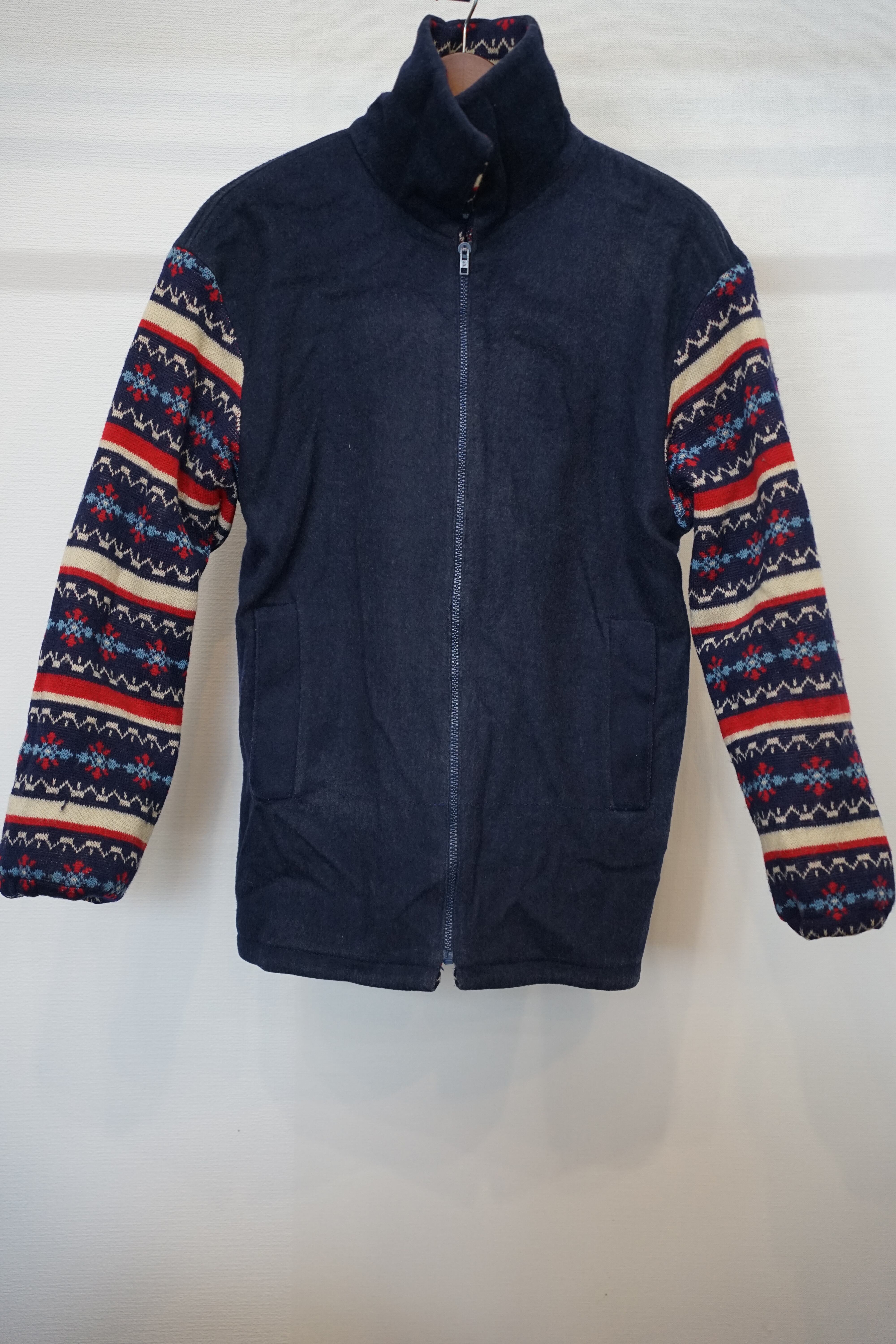 ノルディック柄のニット編みボディーにメルトンウールの袖を合わせたリバーシブル仕様。