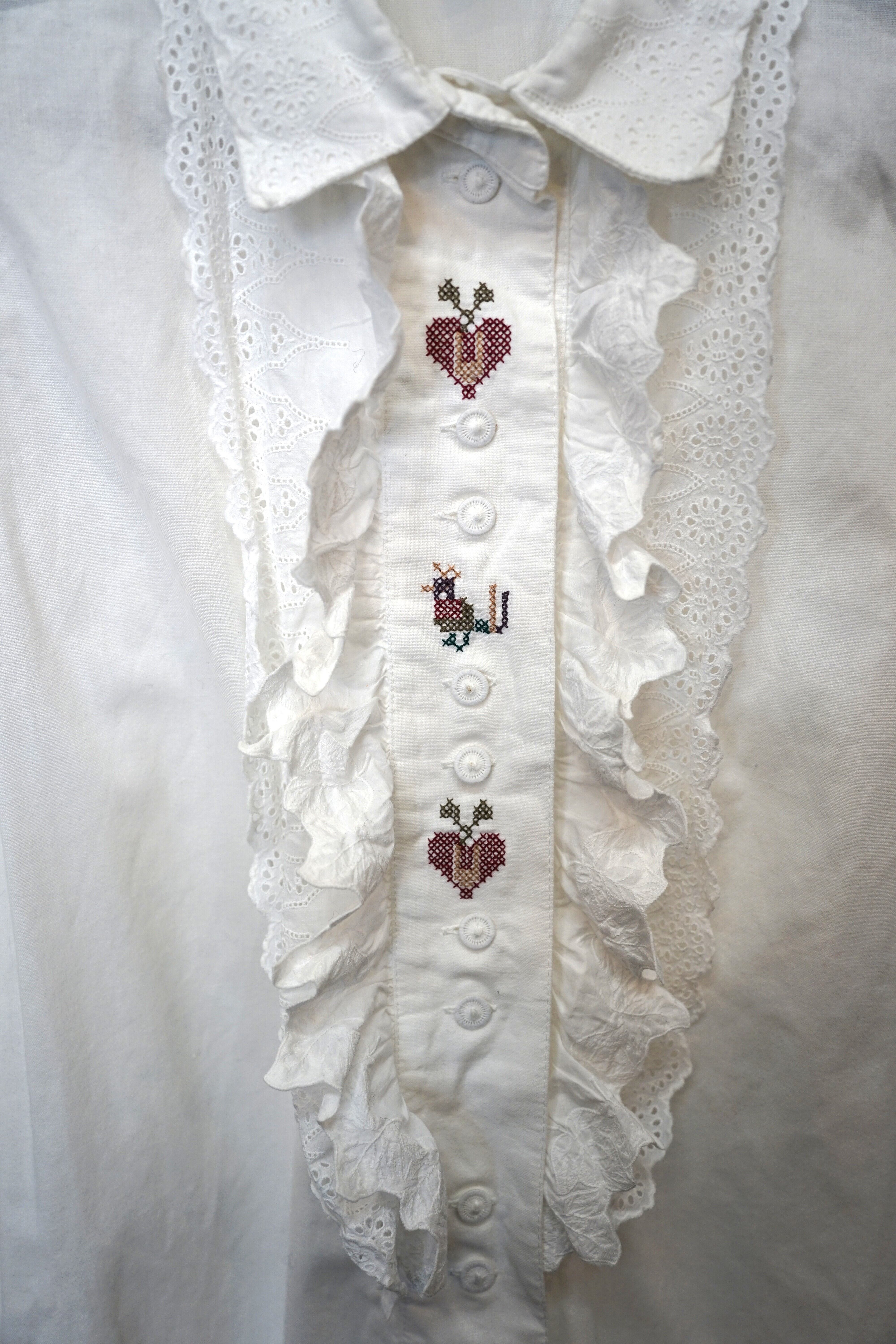 襟元のレース使いと、胸元のボタンに沿ったフリルと刺繍が非常に特徴的なブラウスです。