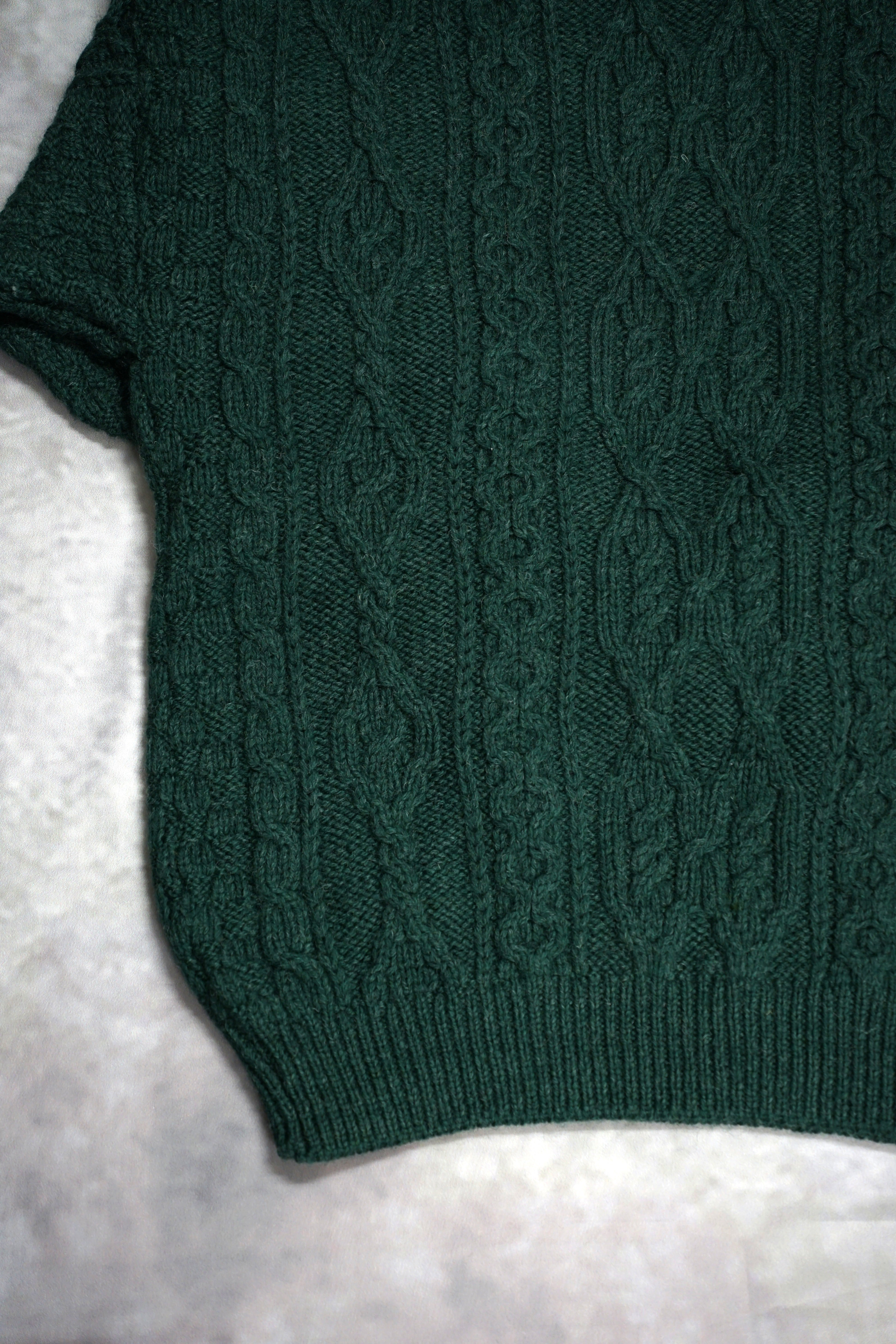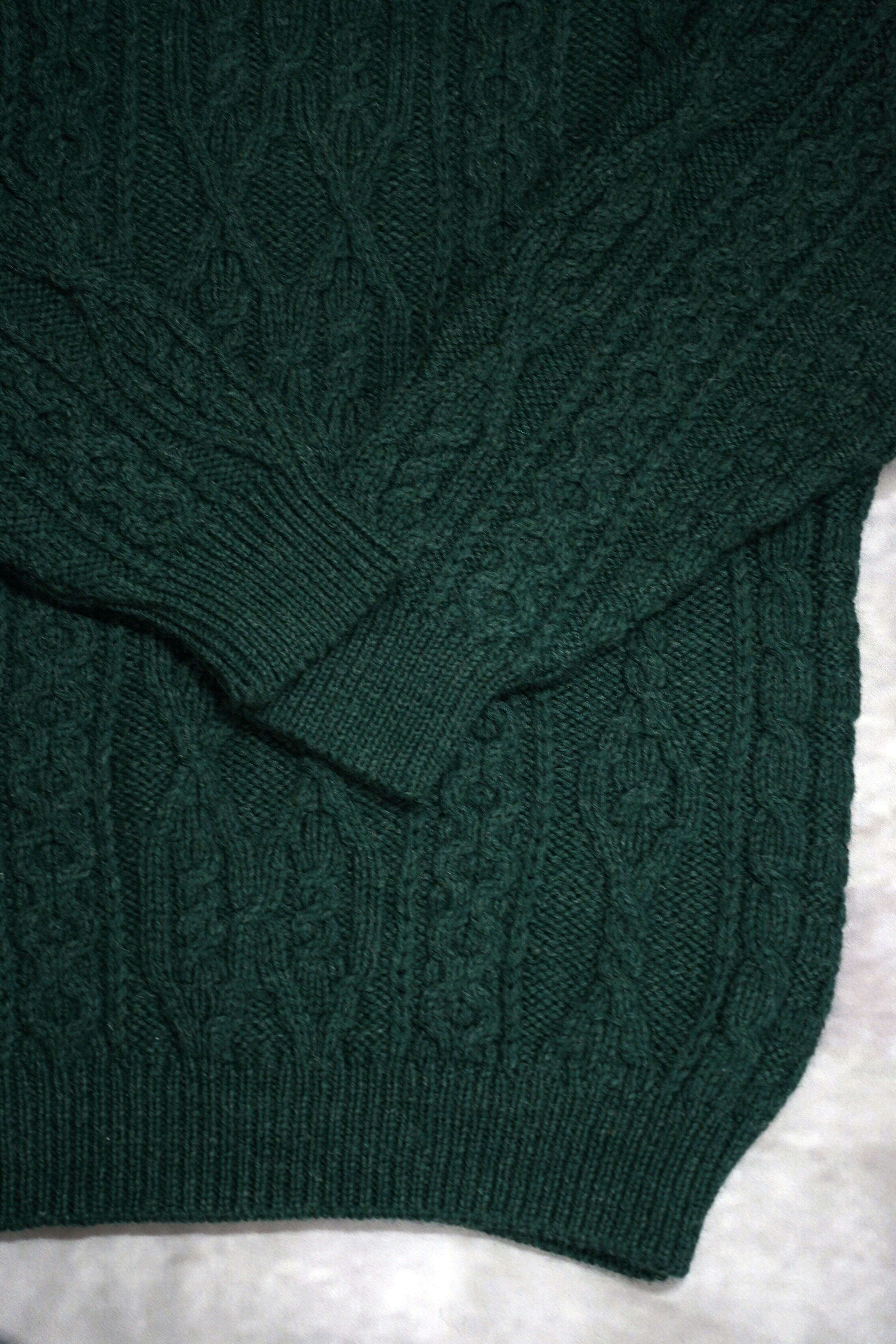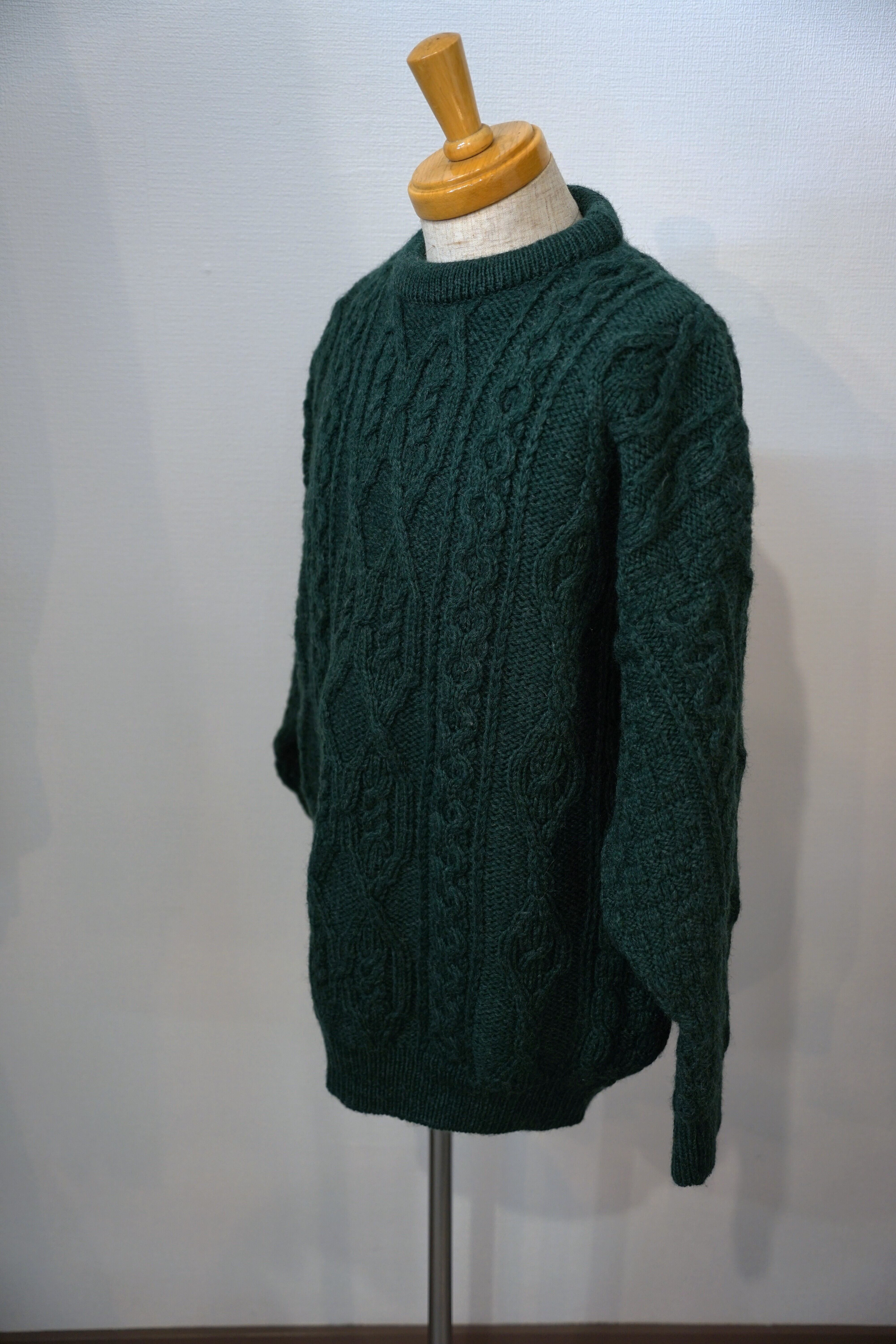フィッシャーマンニットと言えば生成りのイメージが強いですが、こちらの商品はグリーンカラーになっておりますのでちょっと人とは違ったものをお探しの方におすすめです。